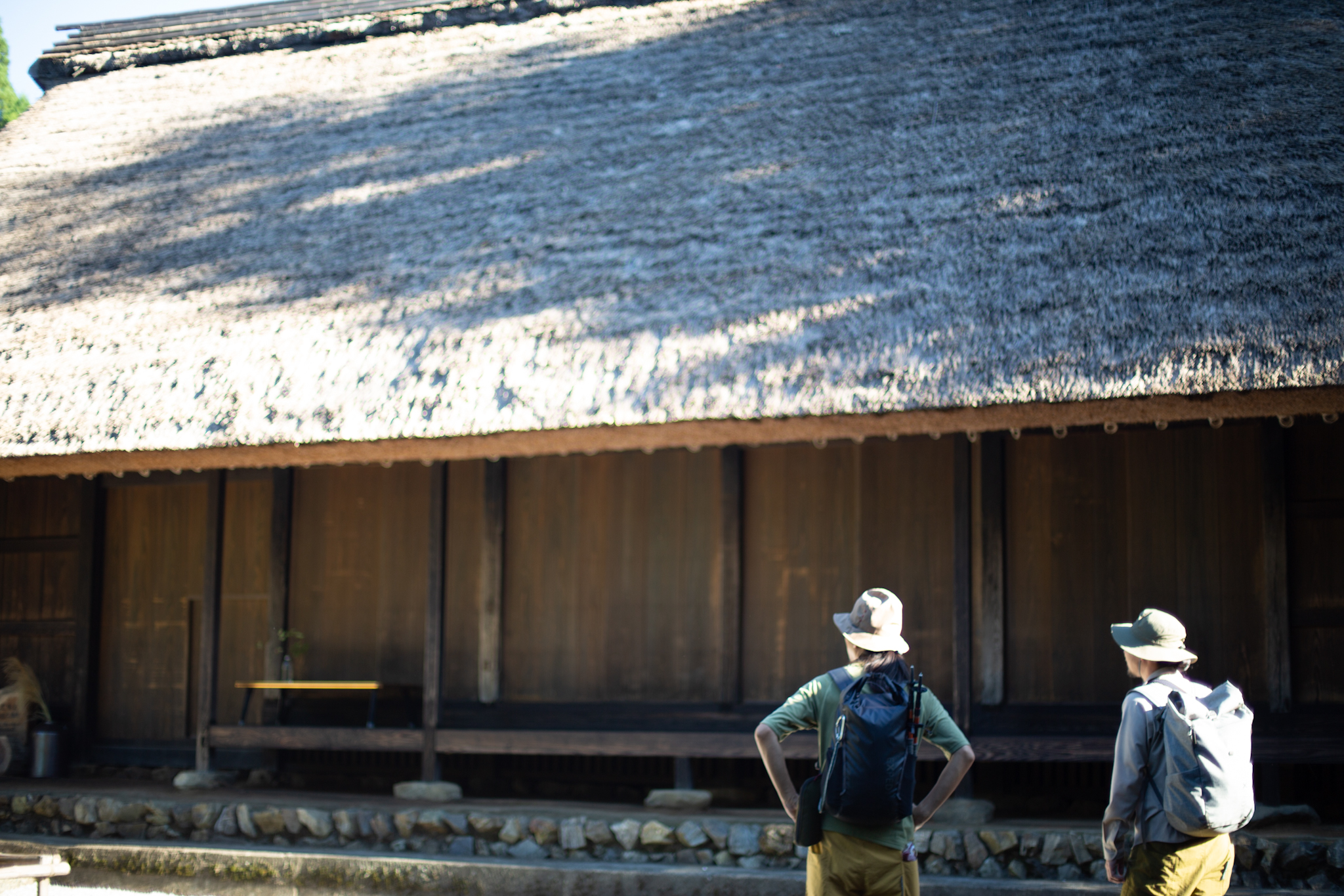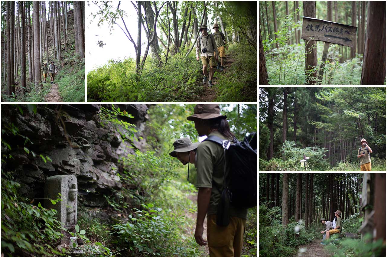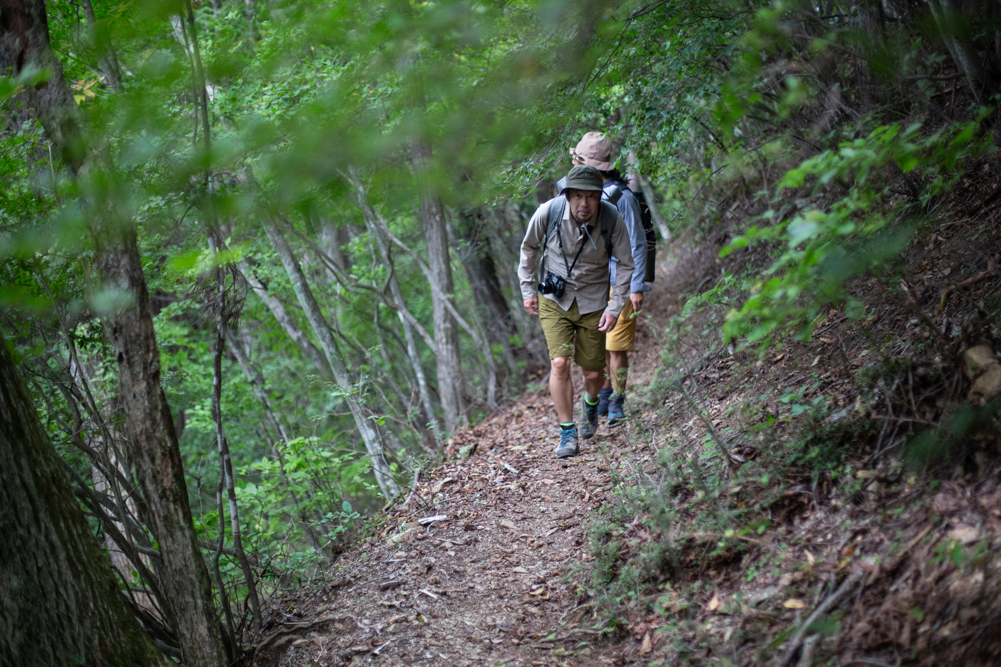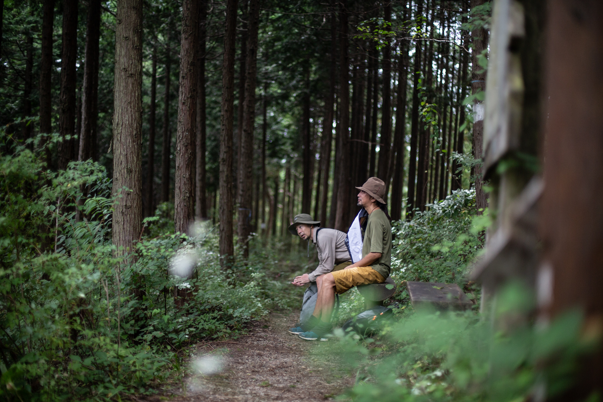 小林家住宅をあとにした僕たちは、茂雄さんに教わった尾根道へと向かった。この道は、かつて小林家の人たちが馬の背に木炭を積んで歩いた生活の道であった。徐々に標高を上げながら山道を辿っていくと、立派な茅葺き屋根で守られた小林家住宅を見下ろすことができる。そこからさらに進んでいくと、杉林のなかに続く快適な尾根道となる。途中には7000〜8000年前に使われた竪穴式住居跡があったことを知らせる石碑があり、時代は異なるけれど周辺にはいくつかの炭焼き窯も作られた。