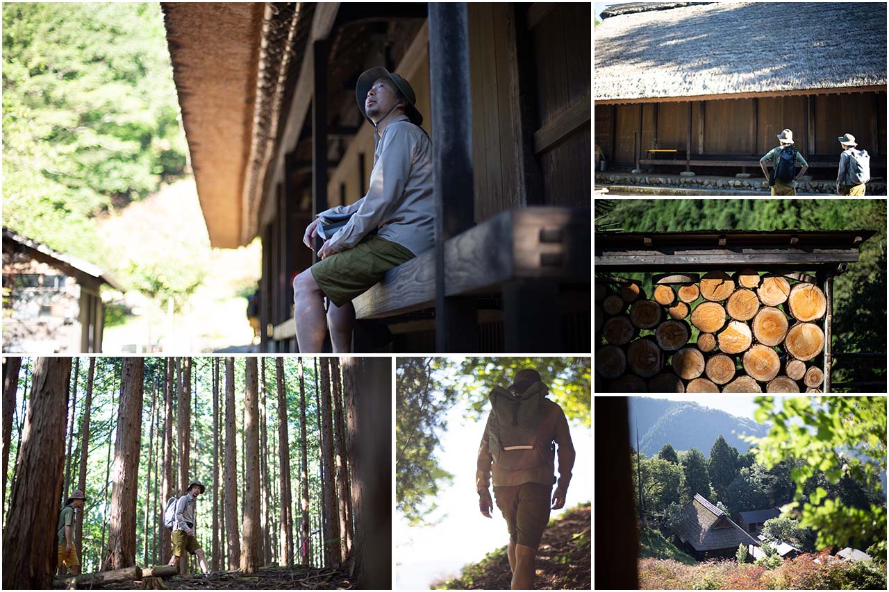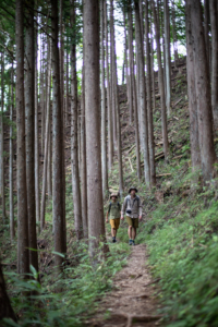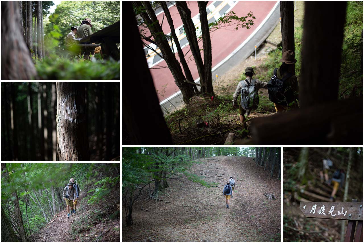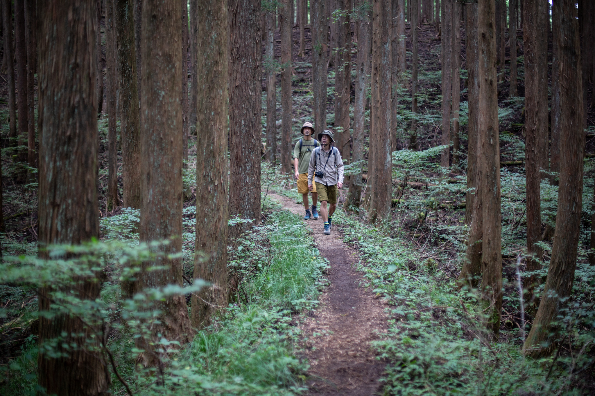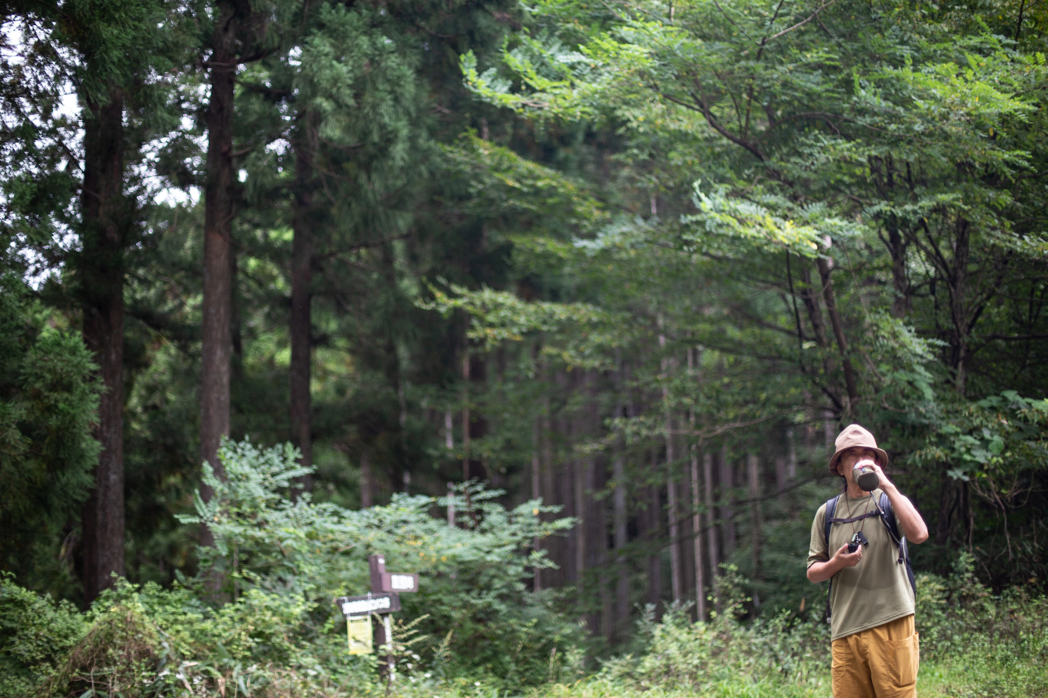 小林家住宅をあとにした僕たちは、茂雄さんに教わった尾根道へと向かった。この道は、かつて小林家の人たちが馬の背に木炭を積んで歩いた生活の道であった。徐々に標高を上げながら山道を辿っていくと、立派な茅葺き屋根で守られた小林家住宅を見下ろすことができる。そこからさらに進んでいくと、杉林のなかに続く快適な尾根道となる。途中には7000〜8000年前に使われた竪穴式住居跡があったことを知らせる石碑があり、時代は異なるけれど周辺にはいくつかの炭焼き窯も作られた。