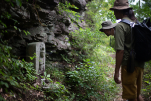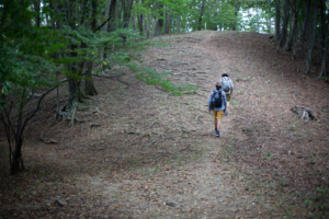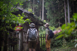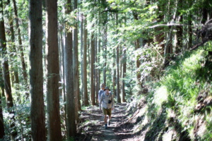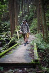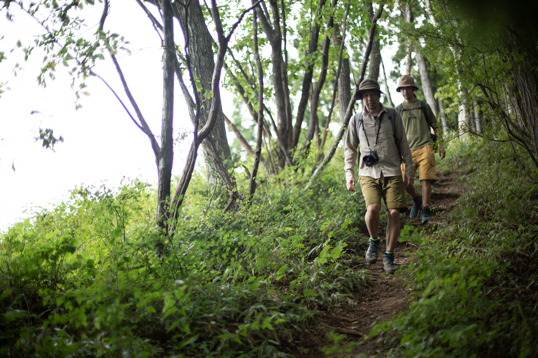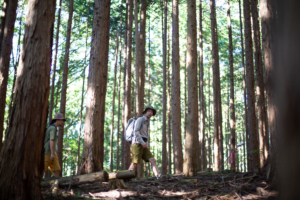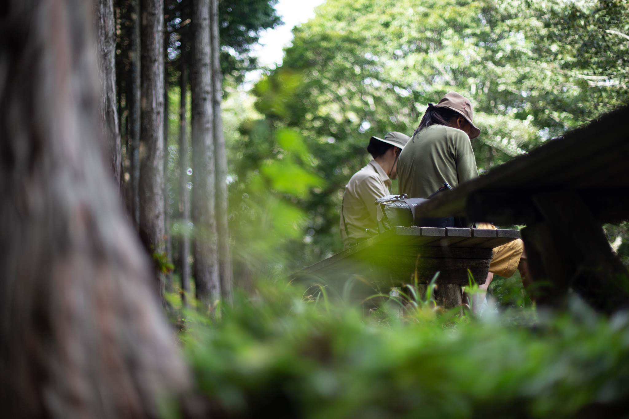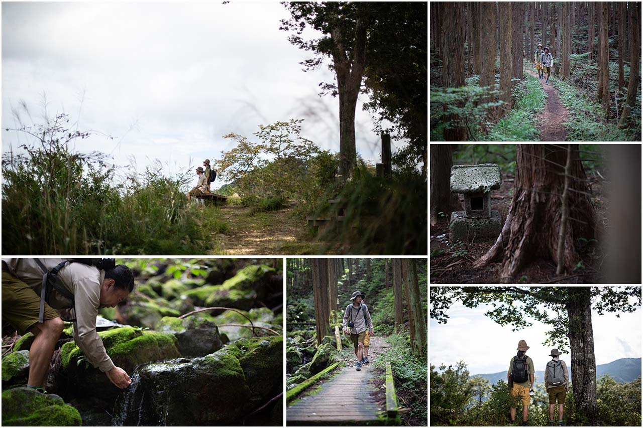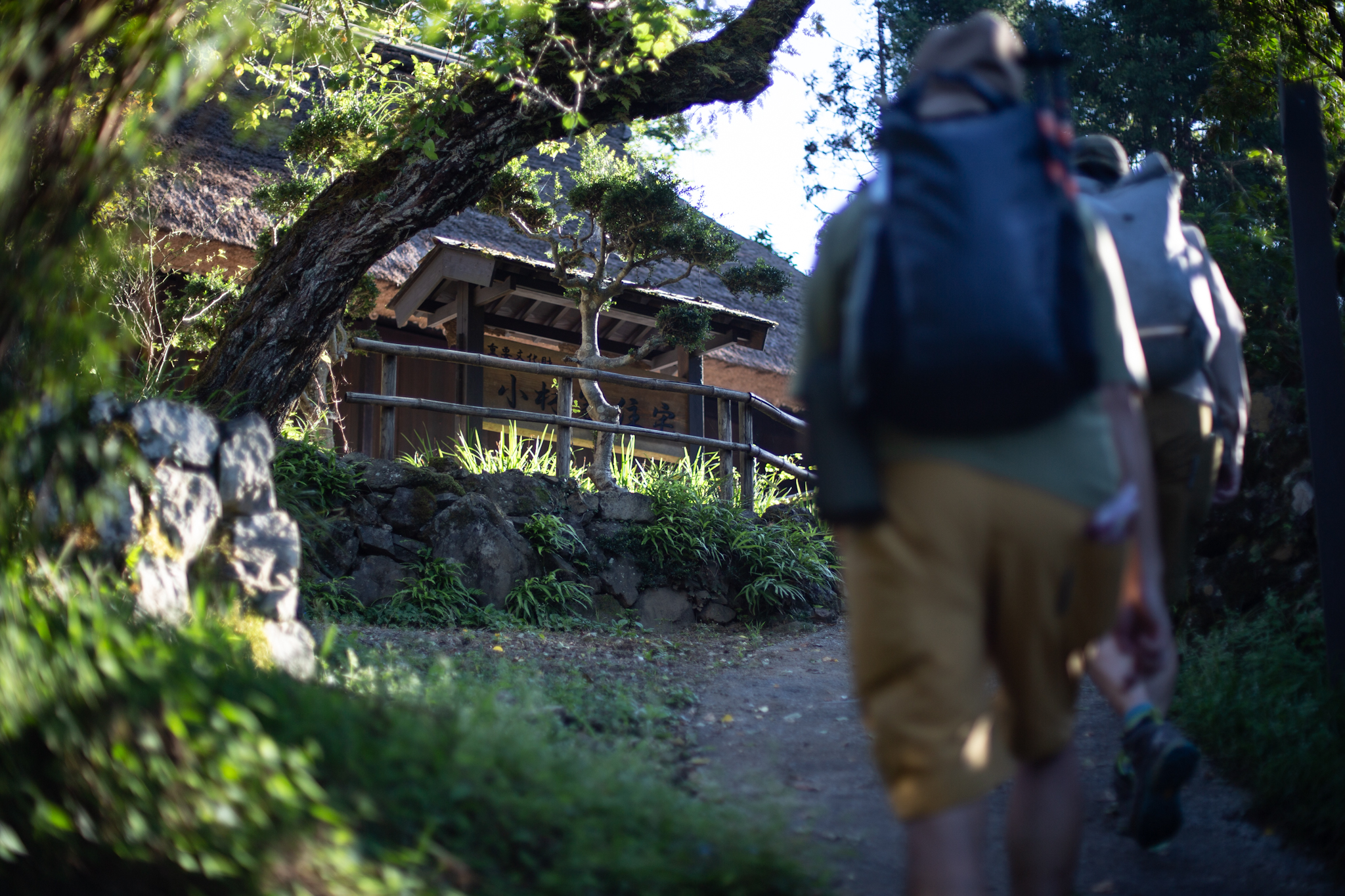 小林家住宅をあとにした僕たちは、茂雄さんに教わった尾根道へと向かった。この道は、かつて小林家の人たちが馬の背に木炭を積んで歩いた生活の道であった。徐々に標高を上げながら山道を辿っていくと、立派な茅葺き屋根で守られた小林家住宅を見下ろすことができる。そこからさらに進んでいくと、杉林のなかに続く快適な尾根道となる。途中には7000〜8000年前に使われた竪穴式住居跡があったことを知らせる石碑があり、時代は異なるけれど周辺にはいくつかの炭焼き窯も作られた。