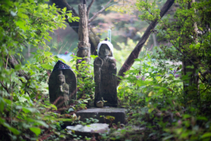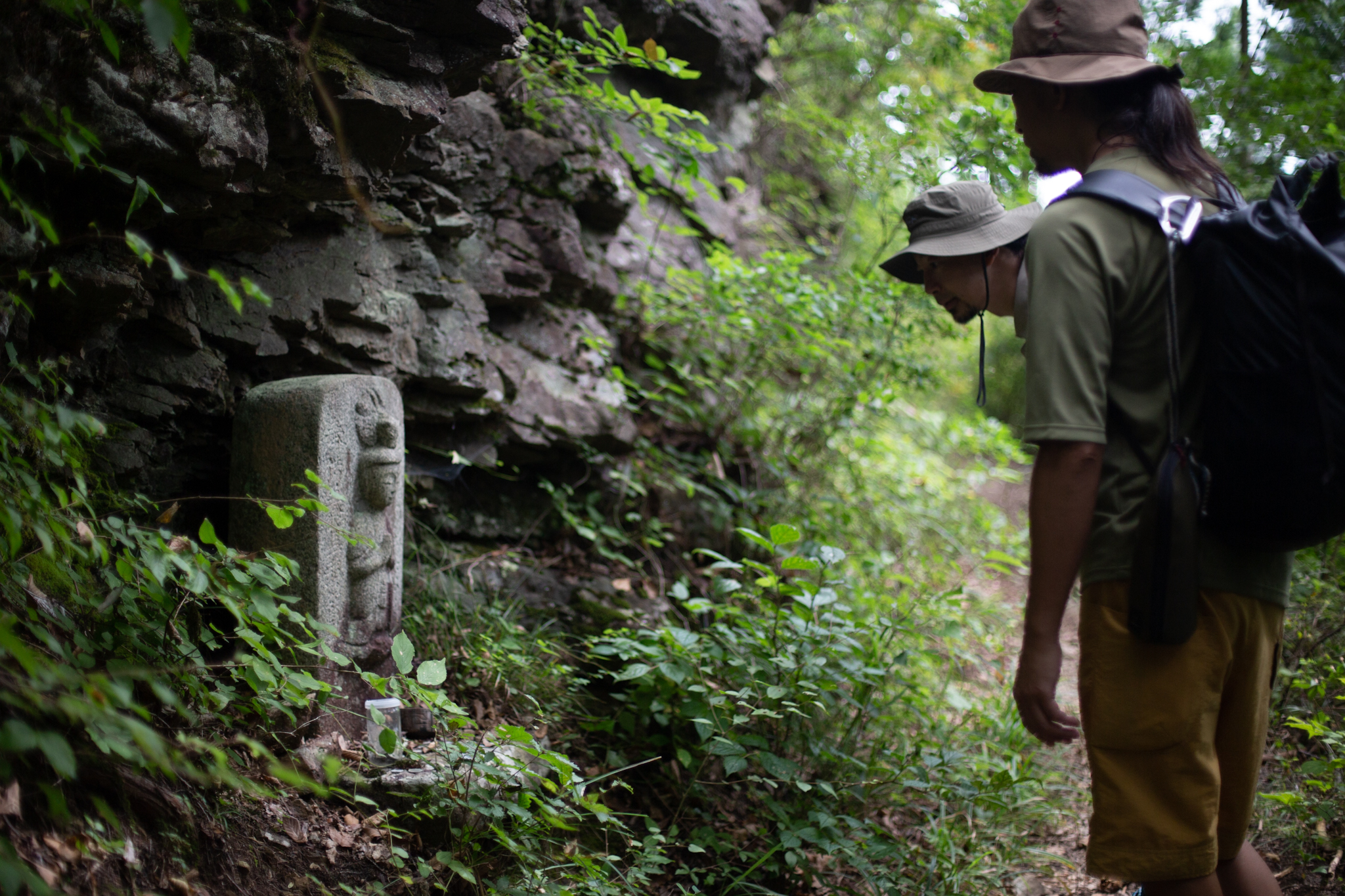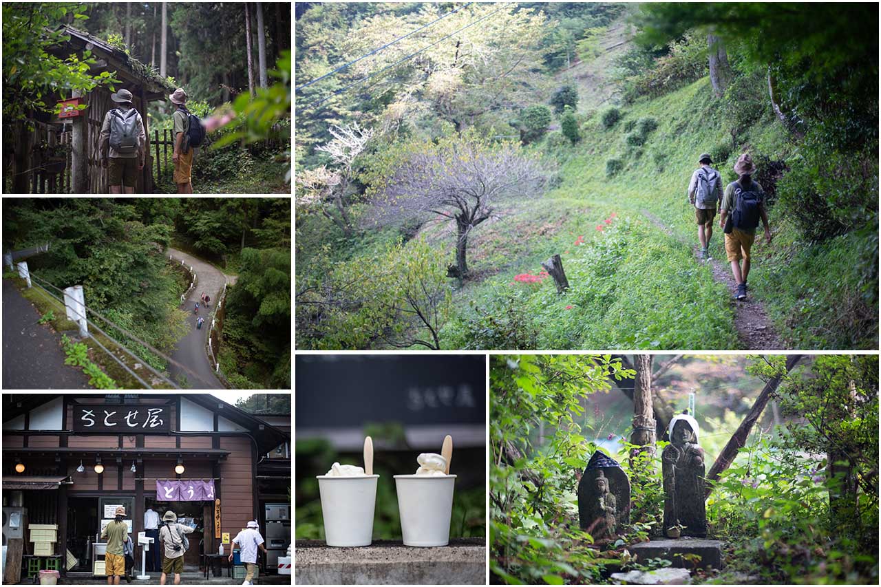 峠の茶店からは急勾配の舗装路を降り、檜原村の中心街へと向かう。民家の軒先を抜けていく脇道もあり、色とりどりの野草で色どられ、長年にわたって旅人たちを見守ってきたのであろう地蔵たちに迎えられる。