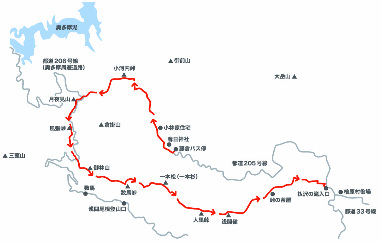 ACCESS & OUT/出発地点は、JR武蔵五日市駅から西東京バスで約50分の終着点「藤倉」バス停である。登山口は、バス停から10分程歩いた春日神社脇にある。帰路は、下山口にある「払沢の滝入り口」のバス停から、JR武蔵五日市駅へと戻る。