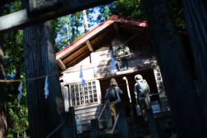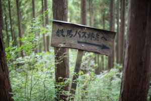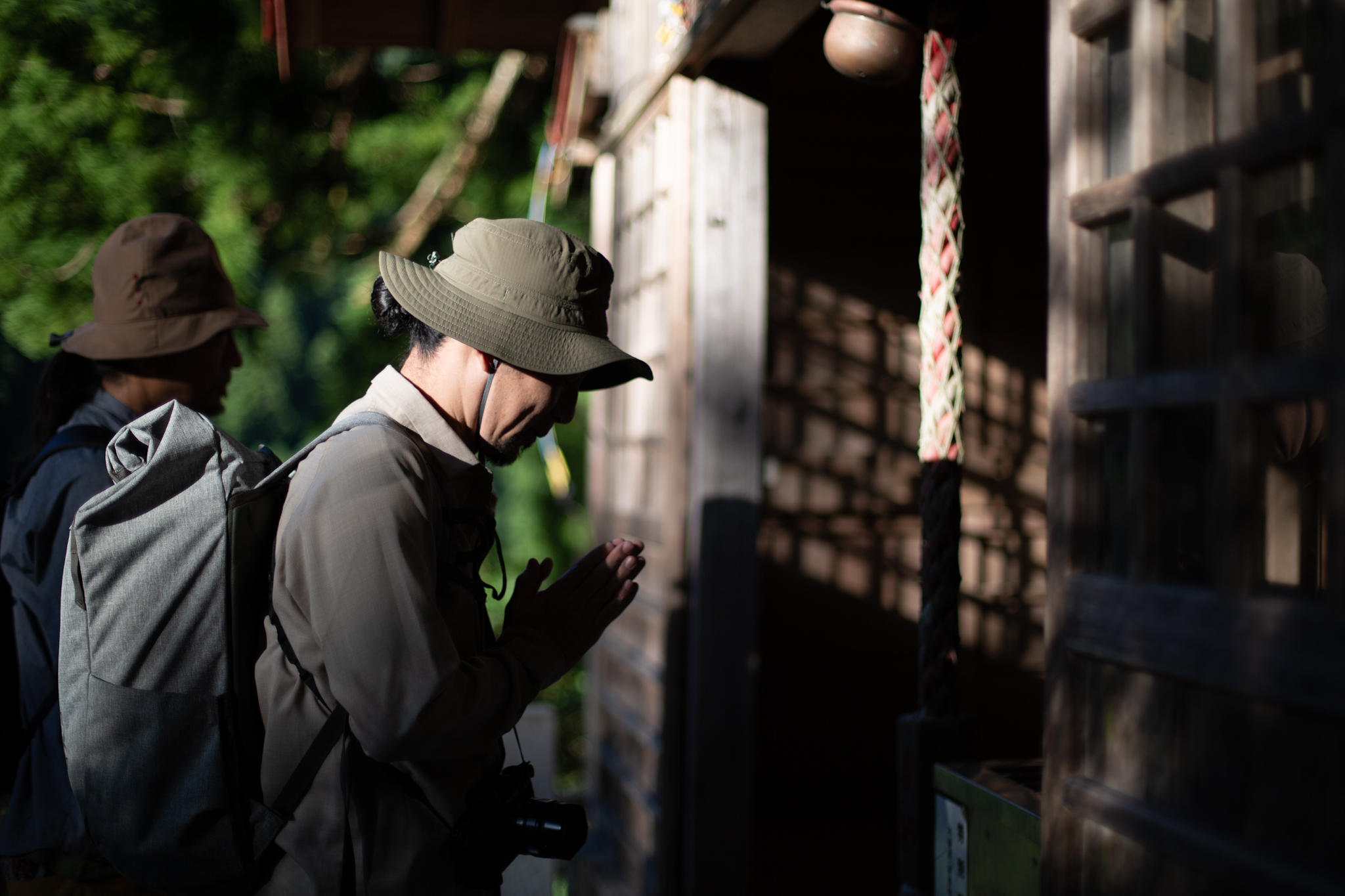 藤倉集落に降り立つと、舗装路を少しだけ引き返す。分岐点を右へ、右へ進み、急勾配になった車道を辿って春日神社へと向かった。背後の丘の上には、近隣の子供たちが通った藤倉小学校跡があり、神社脇に「小林家住宅・徒歩約30分」という看板が掲げられている。
