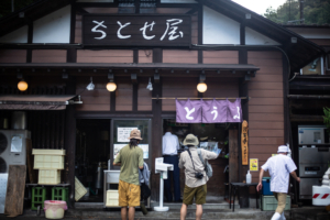 浅間嶺までくれば、下山口とした払沢の滝はまもなくである。その途中、地図には「峠の茶店」の表示があるのだが、ここには木炭を運んできたときに泊まる馬宿があった。現在は蕎麦を出す茶屋になっているが、ここに1泊して翌日になるとまた尾根道を引き返して家路についたそうだ。彼らが運んだ木炭は、五日市にあった木炭市場へと持ち込まれたが、その運搬は宿が受け持っていた。