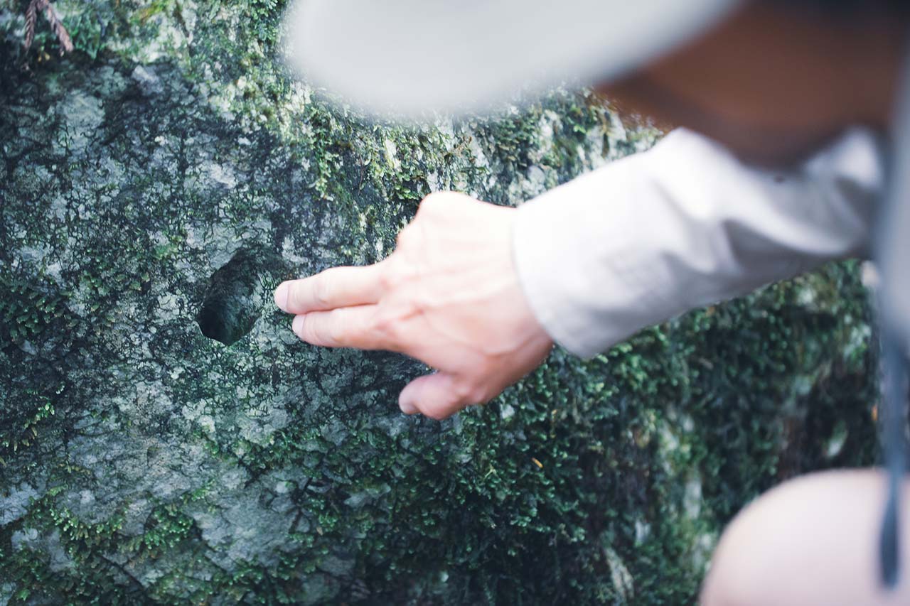 そこで立ち止まって、苔に覆われた石灰岩のあちこちを見てまわった。注意深く岩肌を観察しながら、クサビ跡となる“箭穴”を探した。約10分後、膝下ぐらいの高さのところに、きれいに刳り抜かれた溝穴を見つけた。これが箭穴であろうか。でも、雨で浸食された石灰岩の岩肌を見るかぎり、この溝穴はきれいに削られすぎている。それに、びっしりと苔に覆われている様子から察するに、どうにも新しすぎる。