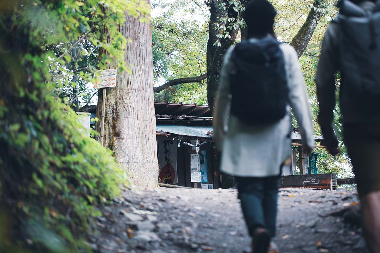 その証拠を見つけにいこう。そんな希望を胸に、僕たちは養澤神社へと向かい、「登山道入り口」と書かれた案内に従って境内の奥へと歩を進めた。しかしながら、その先には「ほかにも、もっと楽な道があるのでは?」、そう躊躇ってしまうほど急な斜面が待っていた。登山道脇に育った木の幹を支えにして歩かなければ、足元からずり落ちてしまいそうなほどの急登である。