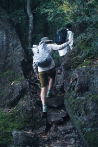 急登から斜面が穏やかになりはじめたのは、神社の境内から汗をにじませながら15分ほど登ったあたりであろう。しかし、息を整えるまもなく、ふたたび急坂が出迎える。