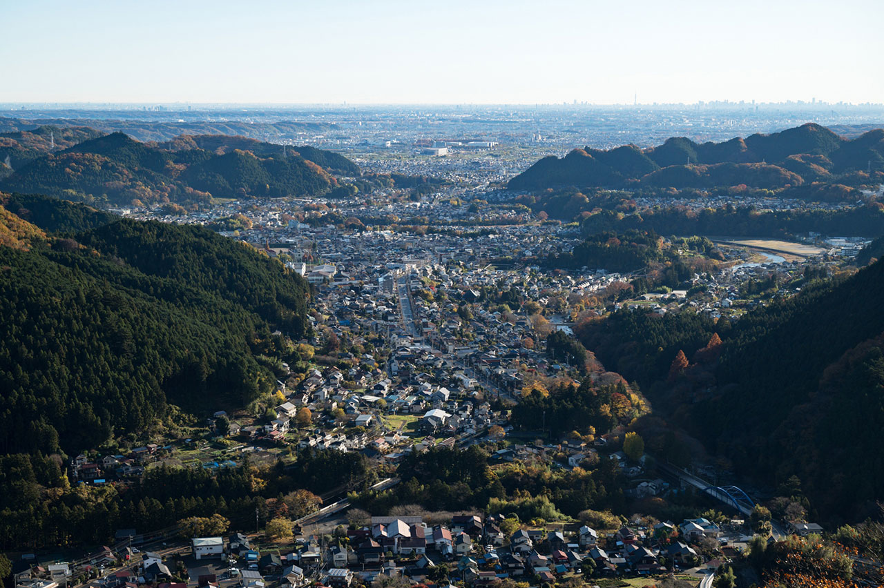 明神神社から歩き始めて約30分。城山の山頂は、武蔵五日市方面の町並みを一望することができる絶景地であった。ここには、かつて戸倉城と呼ばれた山城があった。