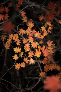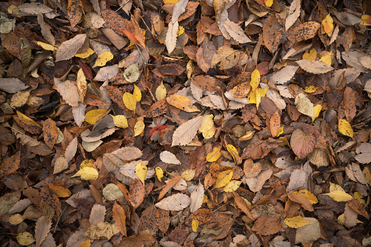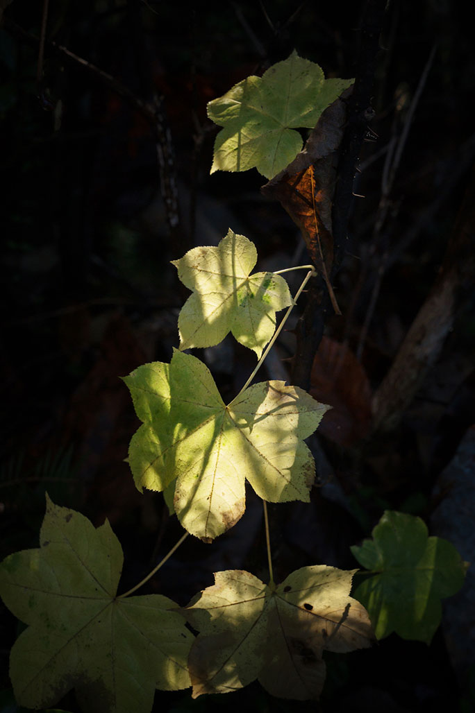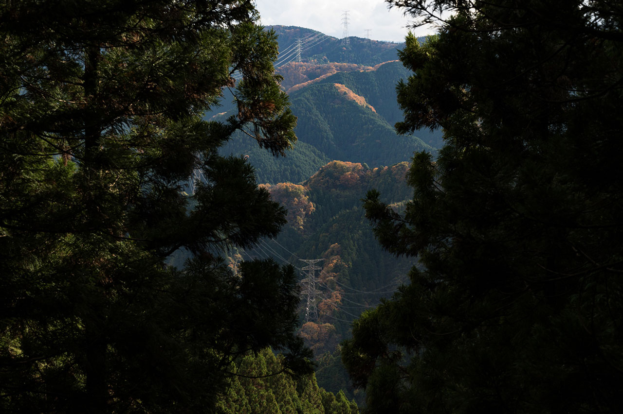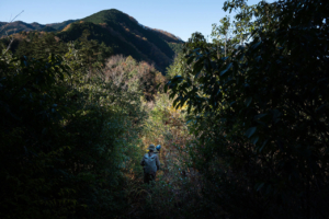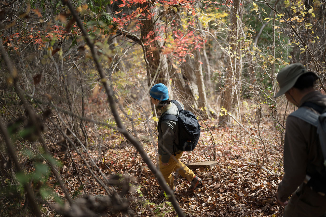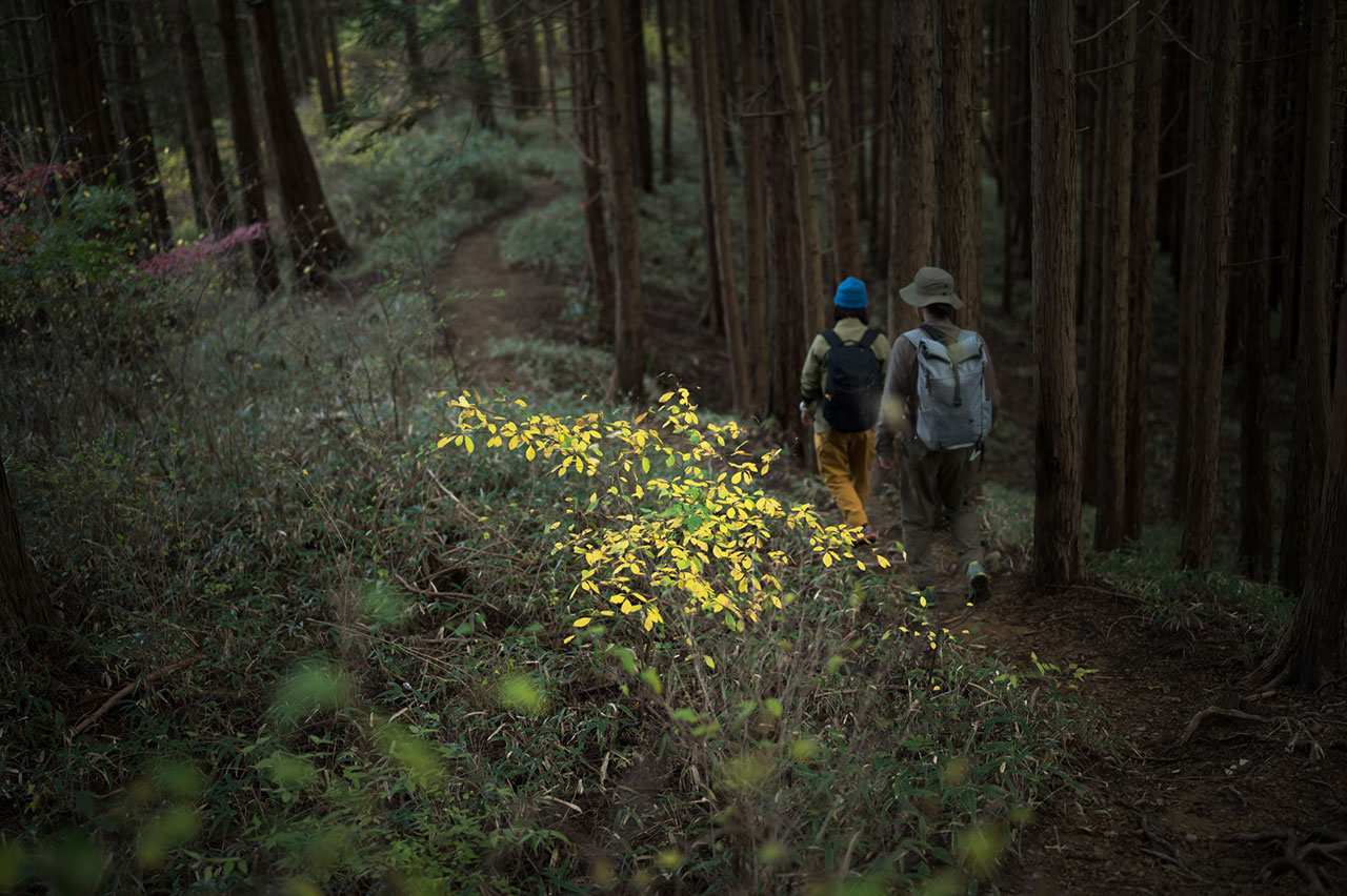 日が傾きはじめ、周辺の山並みは少しずつ影を落としていった。刈寄山から下山場所とした今熊神社までは、約1時間の道のりである。周囲の景色は、ふたたび雑木林となり、その林床は黄色く色づいた灌木で覆われていた。