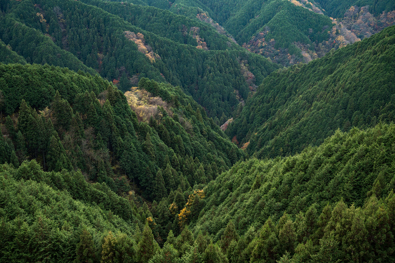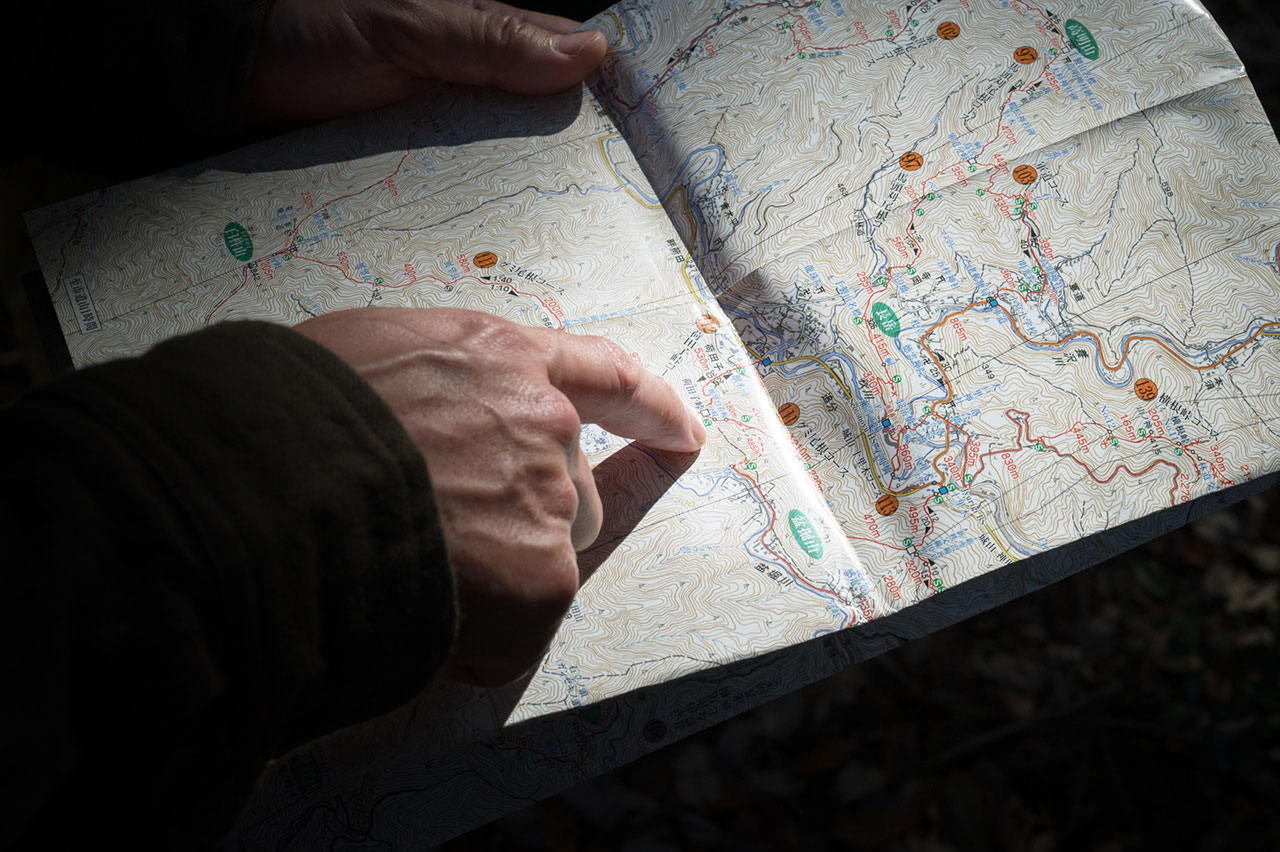 臼杵山、市道山と巡った戸倉三山の3山目、標高687mの刈寄山の山頂を踏むと、僕たちは盆堀川が深く刻む渓谷を眺めた。代次郎さんにとってここは、かつて魚捕りをしたり、休日になるたびに歩いた裏山である。渓流沿いの山肌は杉林に覆われ、山道も林道になってしまったけれど、70~80年前の奥多摩の情景を頭のなかで思い描く。