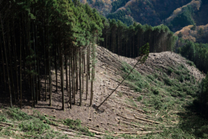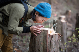 甲高いチェーンソーの音が鳴り止むと、またすぐに「ドスン、ドスン」と杉の木が地面に叩きつけられて、バウンドする音が聞こえてくる。ようやく職人の姿が見えるところになって、その様子を眺めた。手ぎわよく根元に切れ込みを入れて、驚くほどの早さで次々と杉の大木を倒していく。