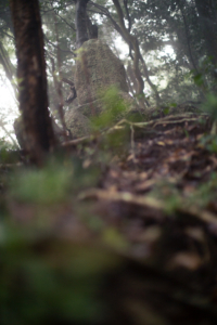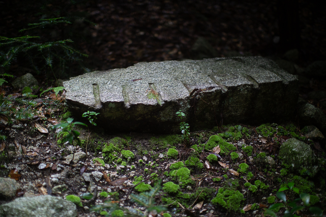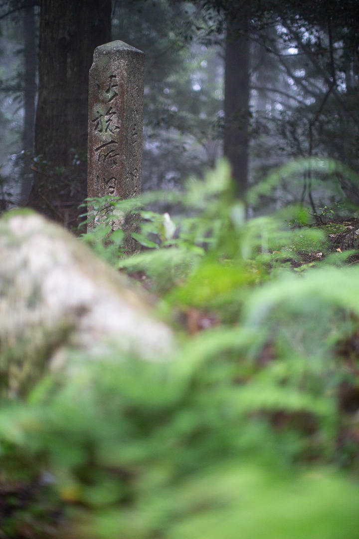 大きな石が並べられた登山口から歩きはじめると、シトシトと雨は降り続き、林道脇に植えられた杉の木の葉からは雨粒がしたたり落ちていく。道幅は広く、ここを大八車が通っていた昔の景色を想像するのであった。