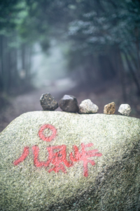 駐車場の脇には大きな石が4つ、5つ置かれており、ここから先の林道への車の乗り入れを防いでいる。その大石のひとつには、赤ペンキで“八風峠”と記されていた。