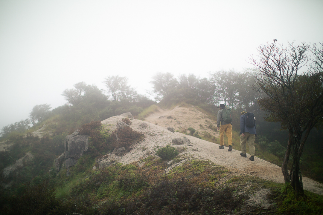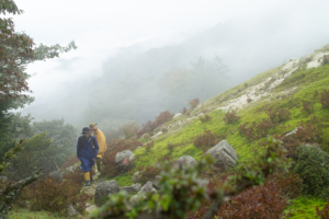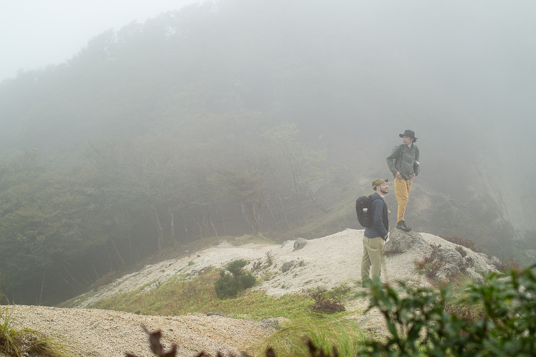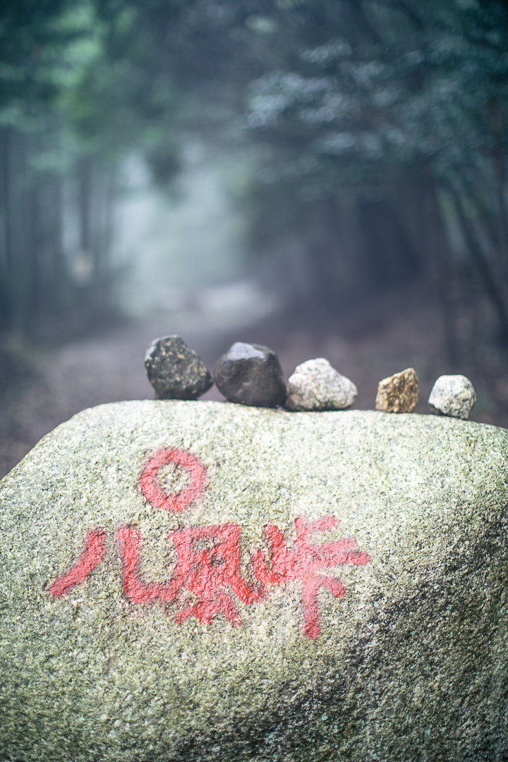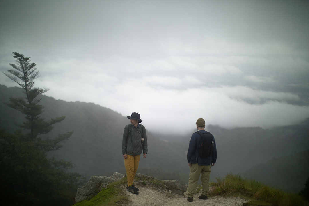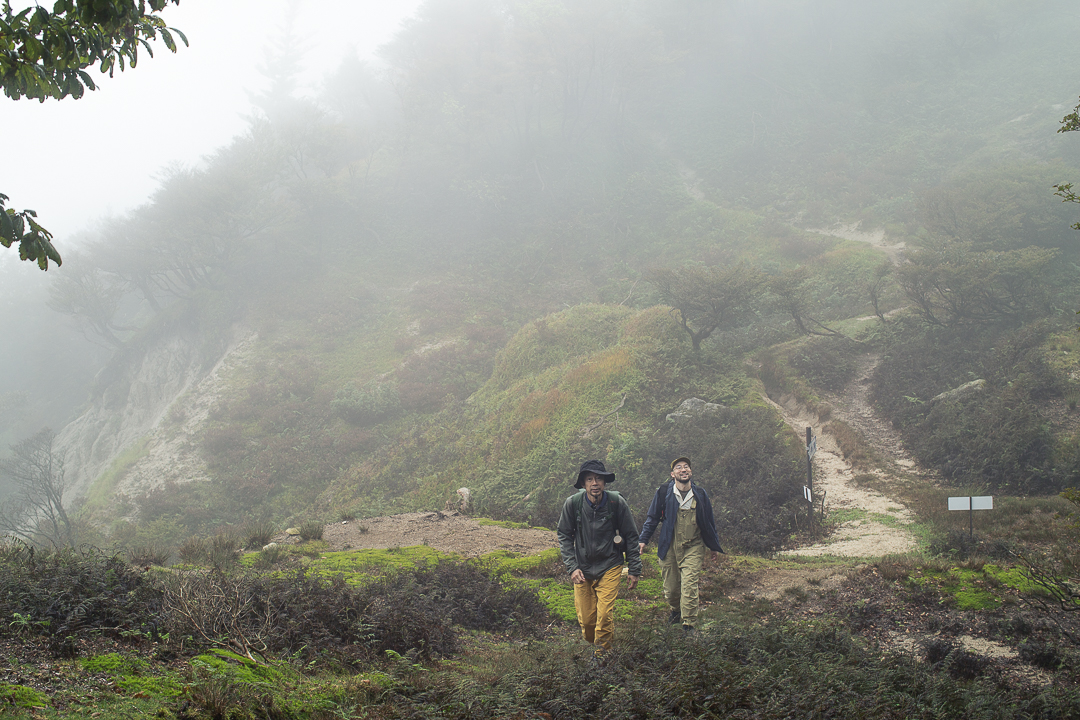 ふたたび雨が降ってきた。雨具を着なおした僕たちは、尾根道を南下して中峠へと向かうことにした。霧に覆われていて展望は望めないけれど、真っ白な花崗岩で覆われた尾根道は、歩いているだけで気分がよいのである。