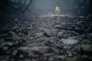 登山道から標高を落としたところを流れていた渓流の音が近づいてきて、視界が開けてきた。木の枝につけられたピンク色のリボンを辿って草木のあいだを抜けて、渓流の水が勢いよく流れる砂防ダムを右手に見ながら河原の小石のうえに足跡を残していく。