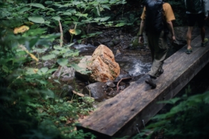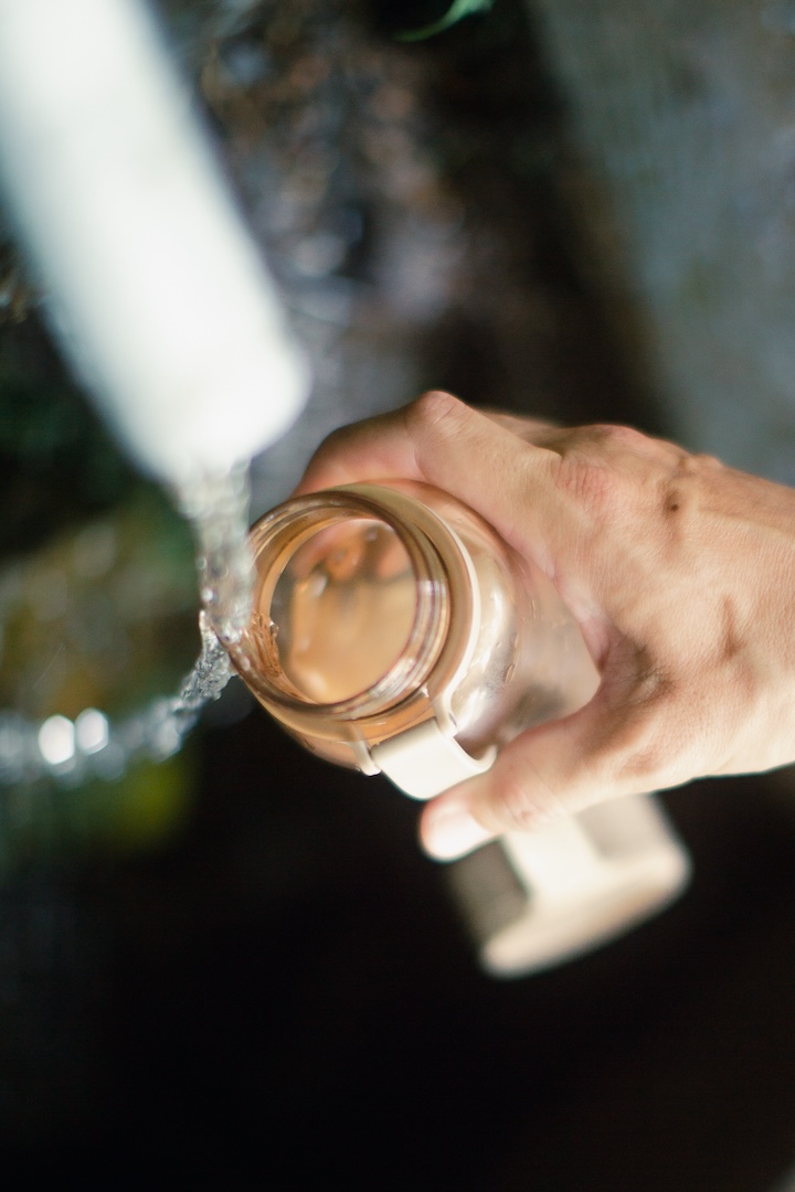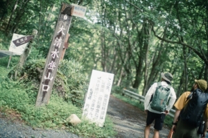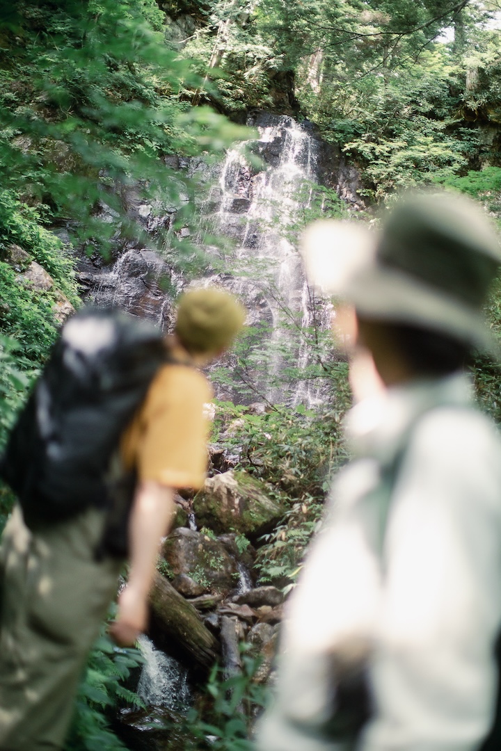 三平橋から、急登を続けること約30分。湧き水が、縁石を叩く音が聞こえてきた。ここは百年以上にわたって、会津沼田街道を辿って三平峠へと向かう旅人たちの休憩地となってきた場所であり、現在まで数多くの登山者たちの喉を潤す石清水が湧いている。かつての旅人にならって、僕たちも湧き水をすくって火照った体を冷やすのである。