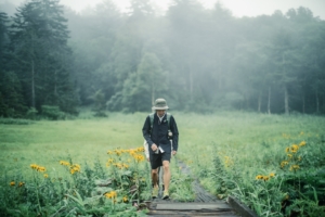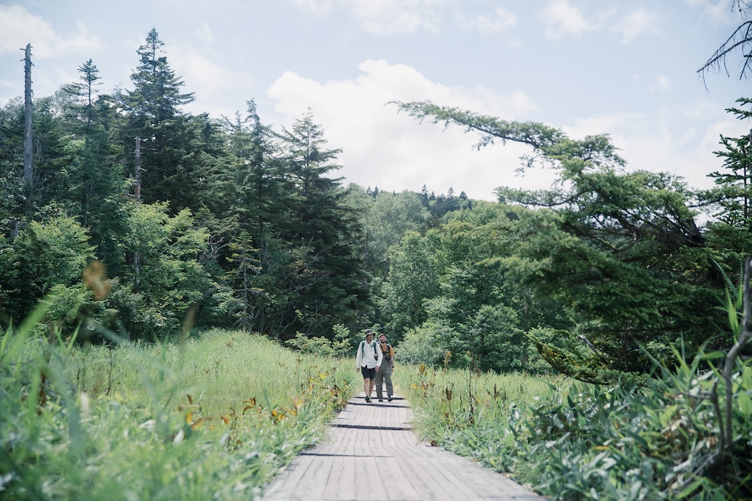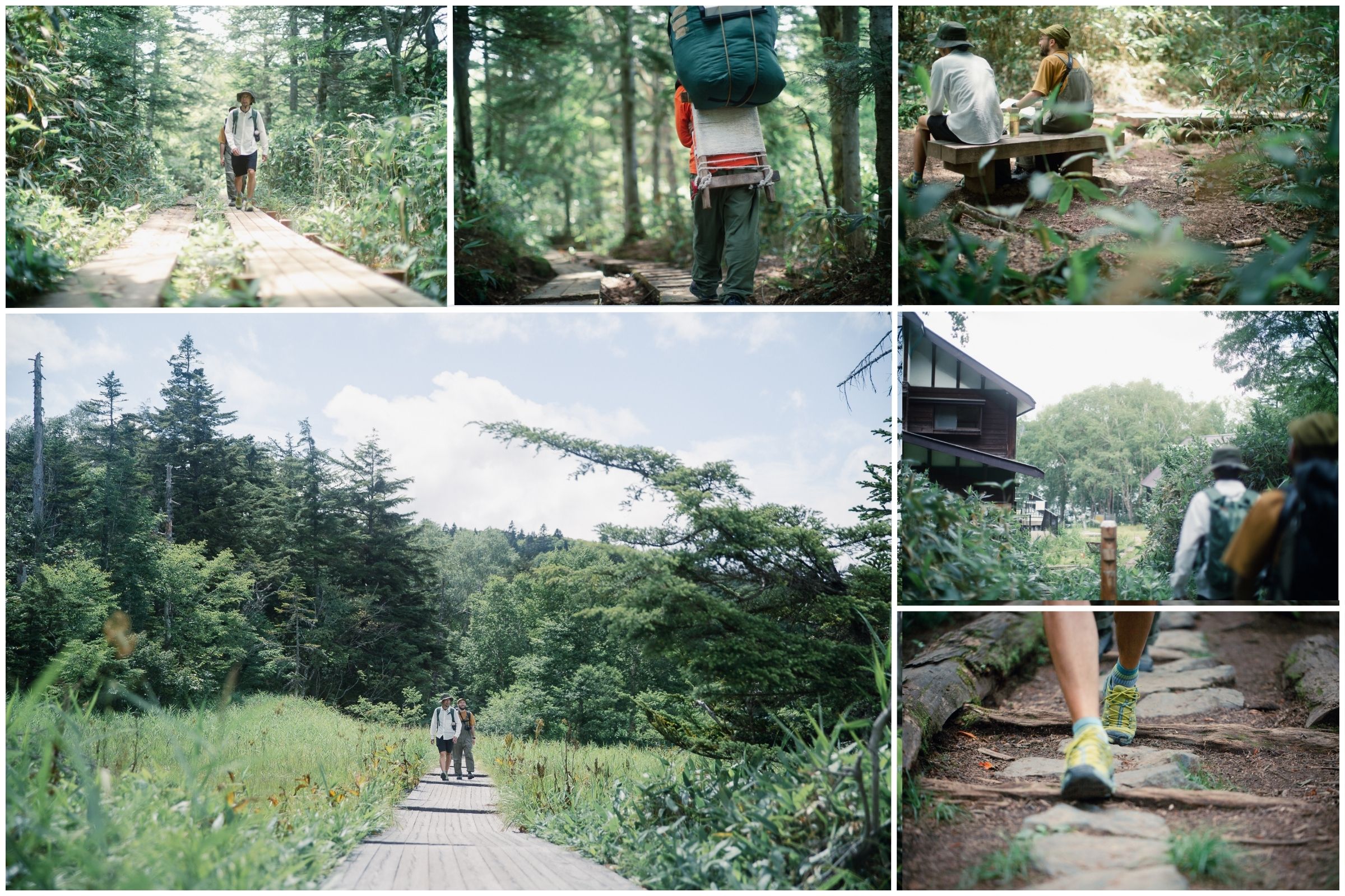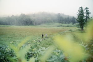 さて、居心地のよい山小屋を後にする時間である。僕たちは、まだ朝靄が残るなか、木道を伝って会津沼田街道の下山口となる七入へと向かうことにした。かつては馬を引いた馬方たちが、街道を通って福島県側から群馬県側へ、福島県側から群馬県側へと荷物を運んだ道である。その蹄跡は、昭和の時代まで見ることができたという。