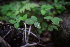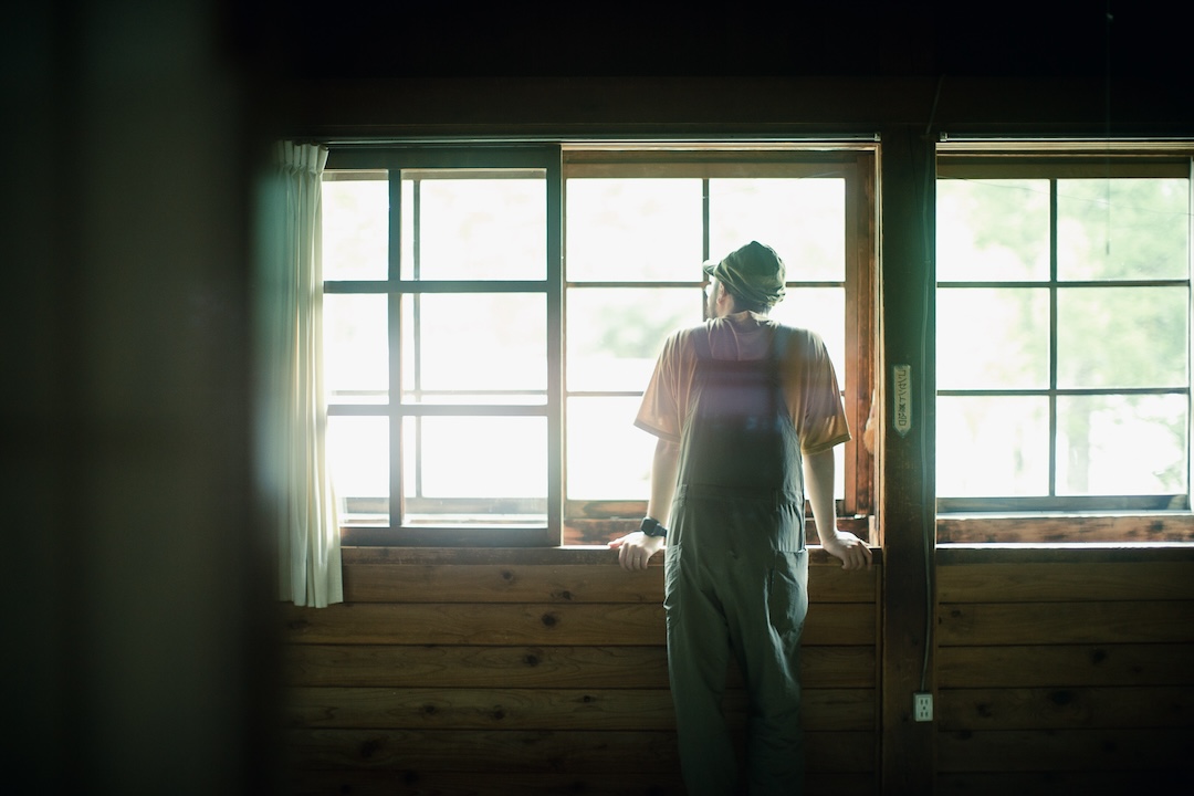 山小屋のガラス戸から屋外を眺めると、少し色づいた日の光が雲の隙間から見えていた。少し雨が降り始めたようで、コツコツと屋根を叩く音がしている。