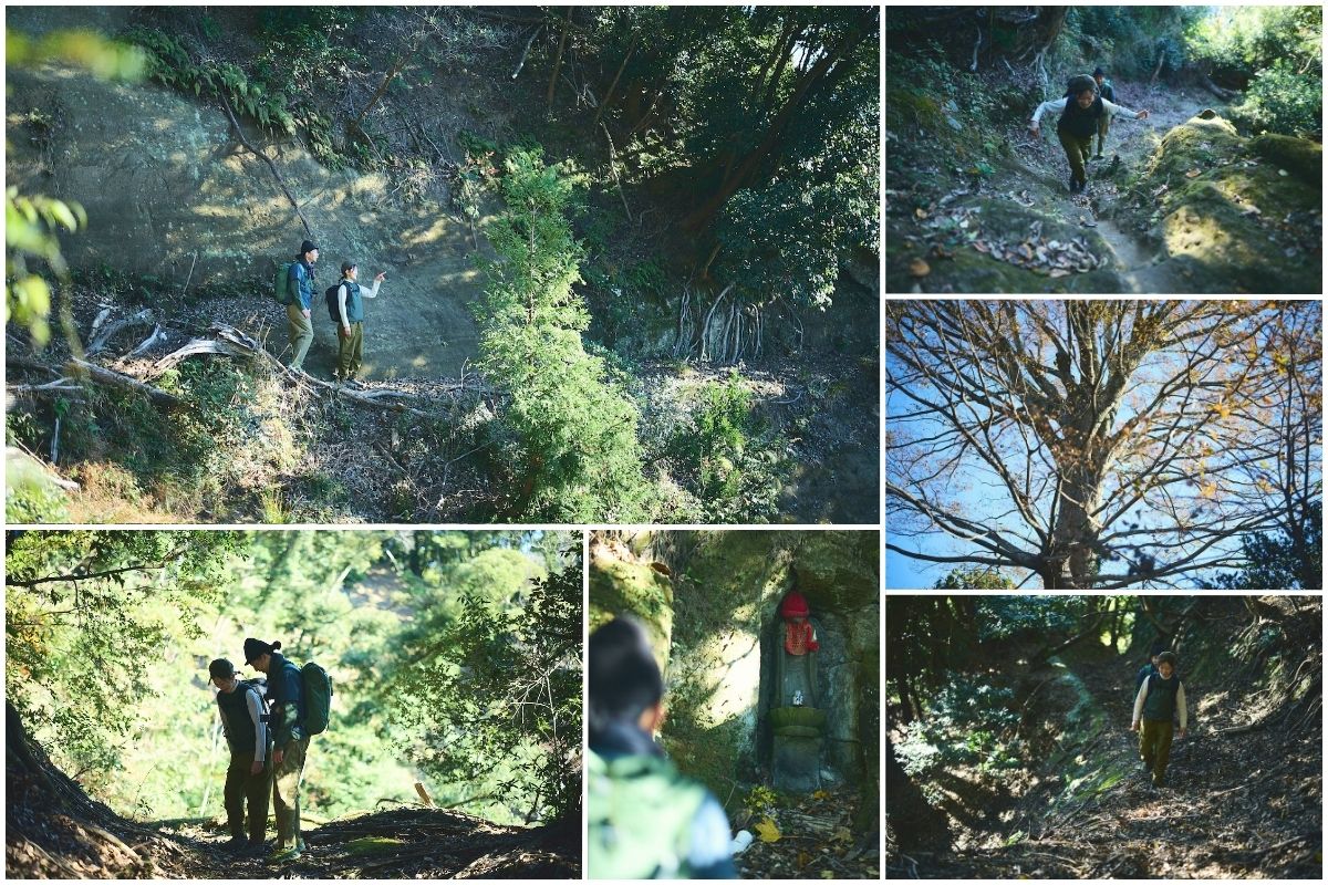 そこからは、ほとんど踏み跡のない森のなかを、四苦八苦しながら本村集落へと下っていく。道中には、歌川広重が「不二三十六景」で描いた鹿野山鳥居崎という名勝地もある。しかし、江戸時代を代表する浮世絵師の心を打った景色は、いま笹薮に覆われてしまって見ることはできなくなっていた。