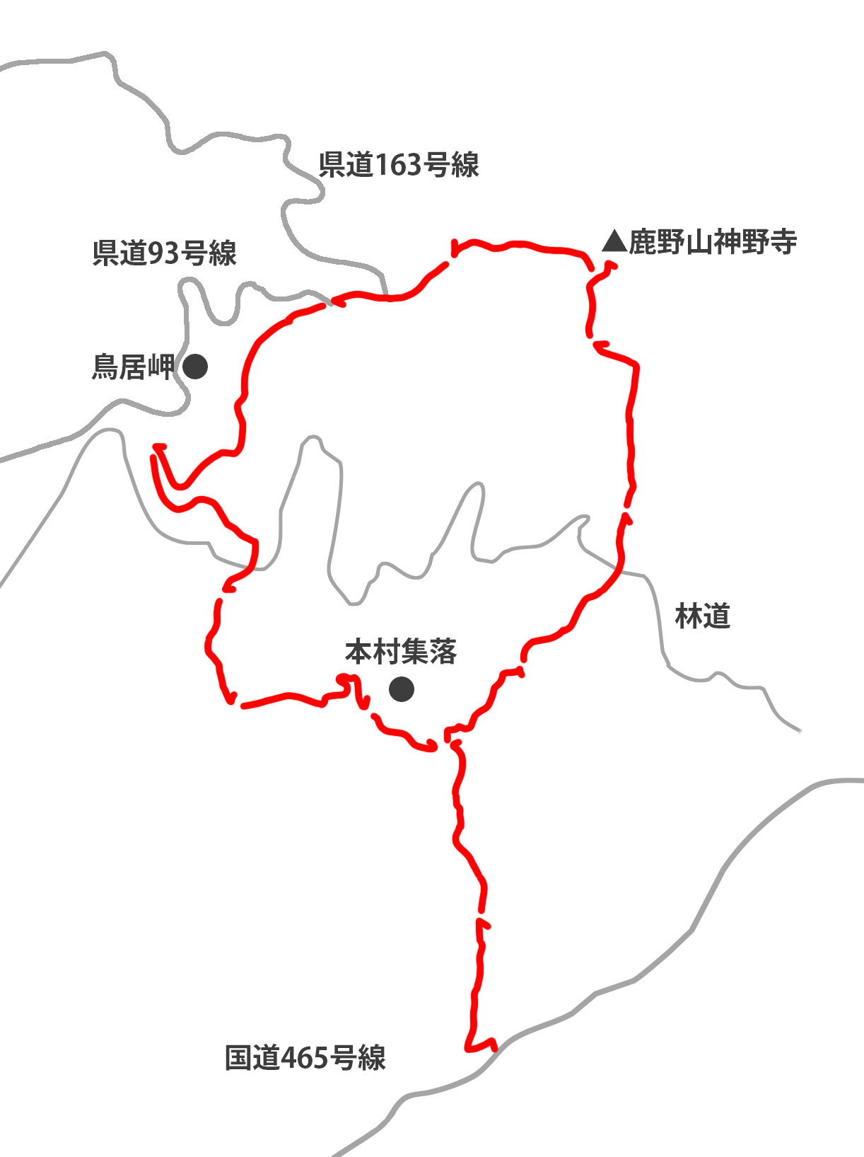 ACCESS & OUT/出発地点、および終着地点とした本村地区への公共交通機関はないため、JR内房線の上総湊駅からタクシーなどを利用する。鹿野山神野寺を出発地点とした周回コースとした場合は、JR内房線の佐貫町駅を出発する神野寺行きの路線バスが利用できる。