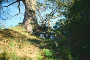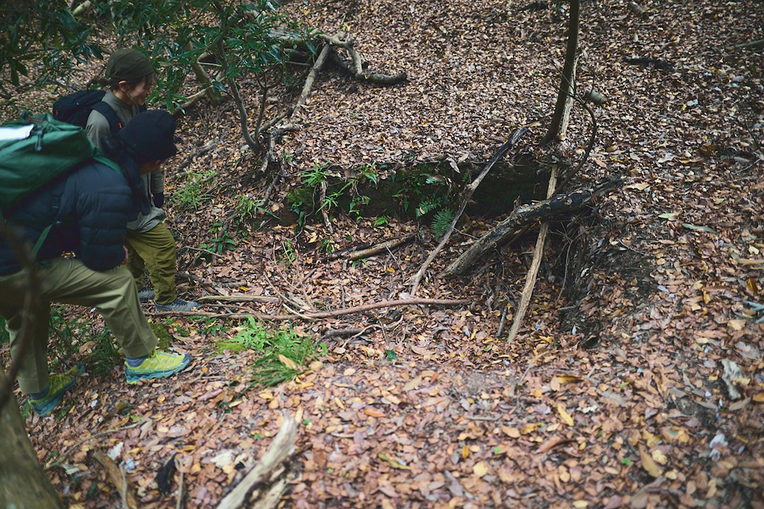 僕たちは迷いに迷ったあげくに、ようやく山道らしい踏み跡に戻ると、木の葉がまあるく敷き詰められ、型を押したような窪地を見つけた。炭焼き窯跡である。窯跡のうえにある小高い丘には割れた湯飲み茶碗などが散乱しており、かつての生活の痕跡が残されていた。本村集落で出会った老爺は、集落の人たちはみんな炭焼きをしながら生活をしていたと言っていたことを思い出すのである。