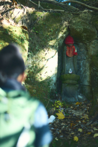 車庫の脇から山道に入っていくと、すぐ左手に大日如来、さらには刳り抜いた岩の壁のなかに立つ石地蔵などを次々と見つけることができる。山道は片側が切れ落ちていたり、両側が切れ落ちていたり、長い年月にわたる人々の往来によって地面が削られた切通しとなったりして神野寺まで続いていた。