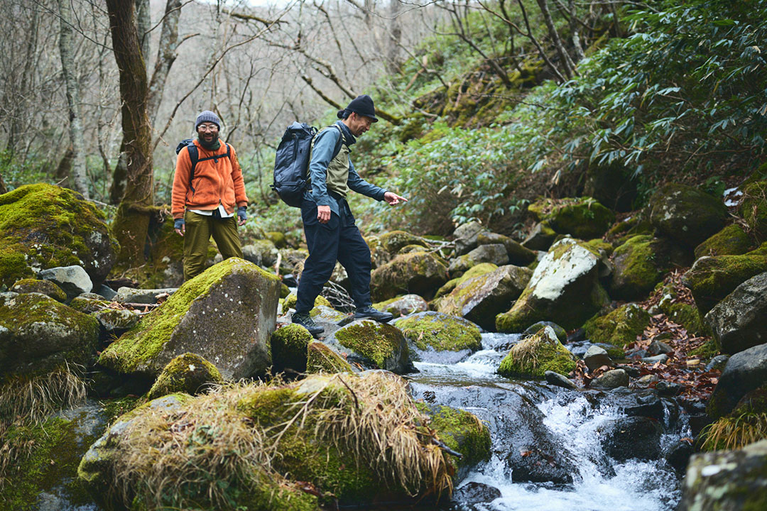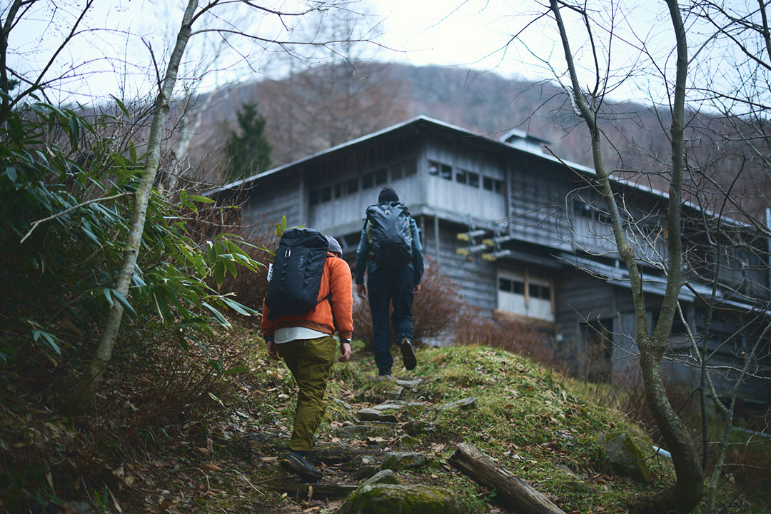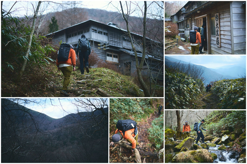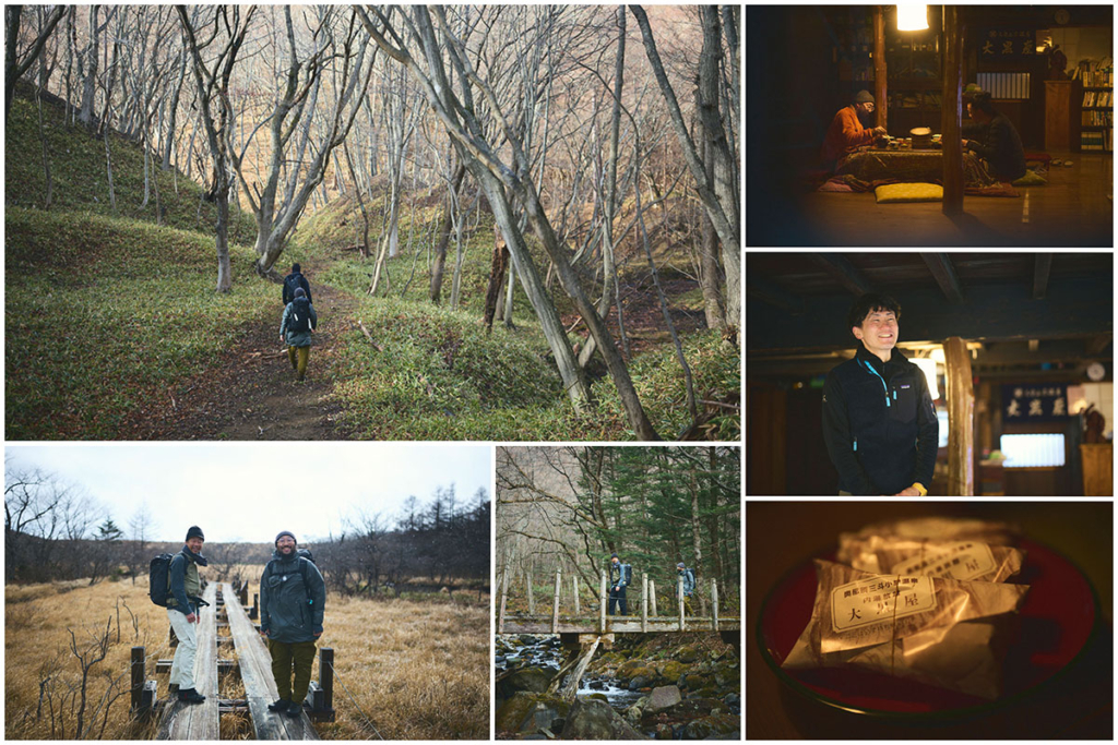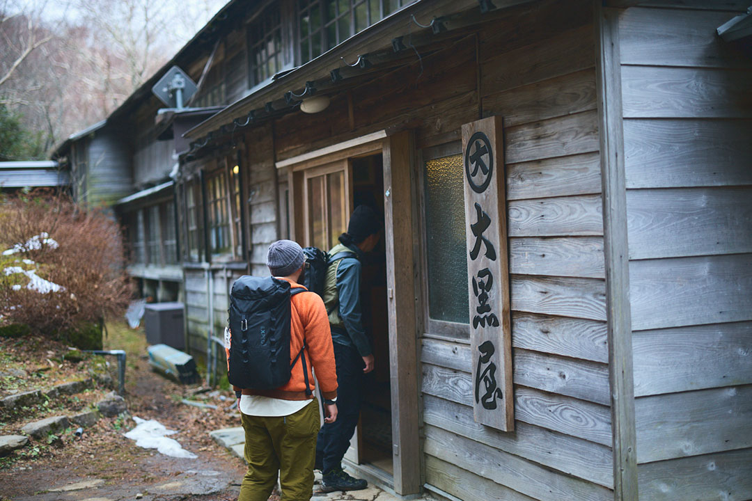 大峠からは、尾根道を越えて、谷間を流れる渓流を渡りながら約1時間30分。今宵の宿とした三斗小屋温泉の「大黒屋」へと到着する。木戸をガラガラ、ゴロゴロッと開くと、そこで山小屋の6代目当主となる高根沢春樹さんが満面の笑顔で出迎えてくれるのであった。