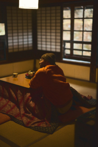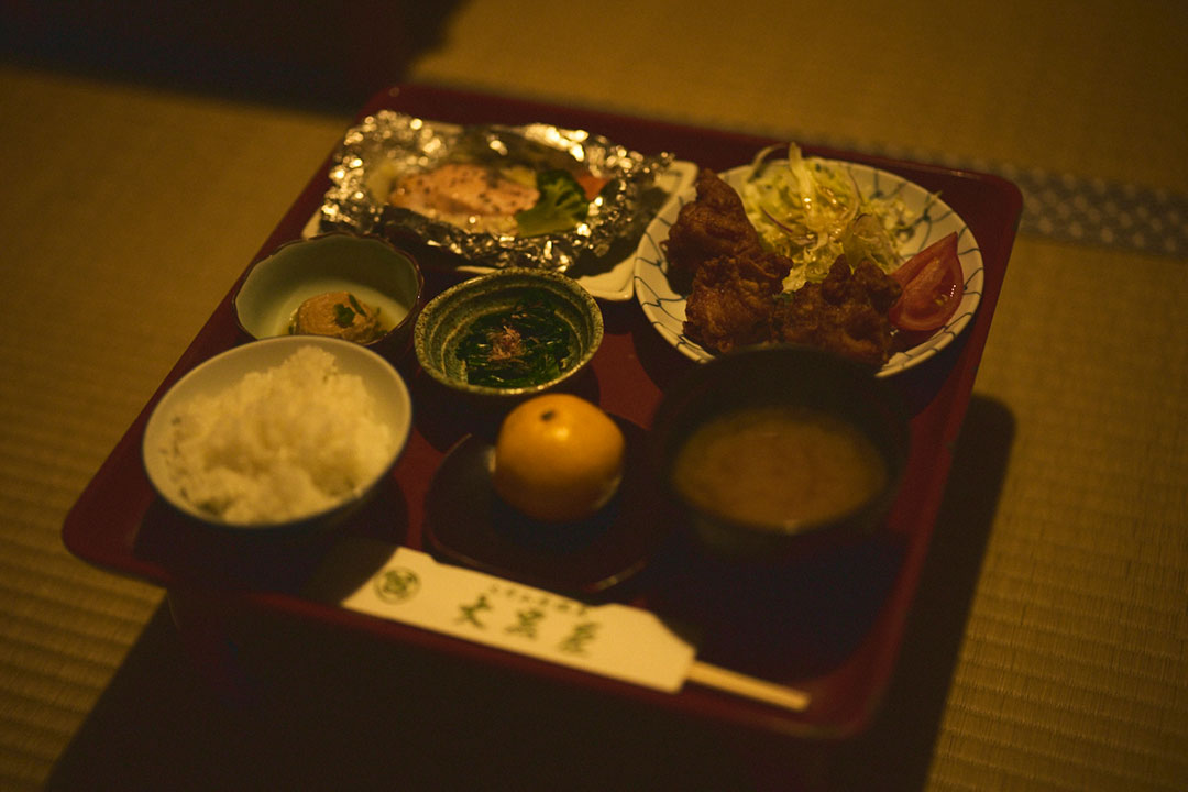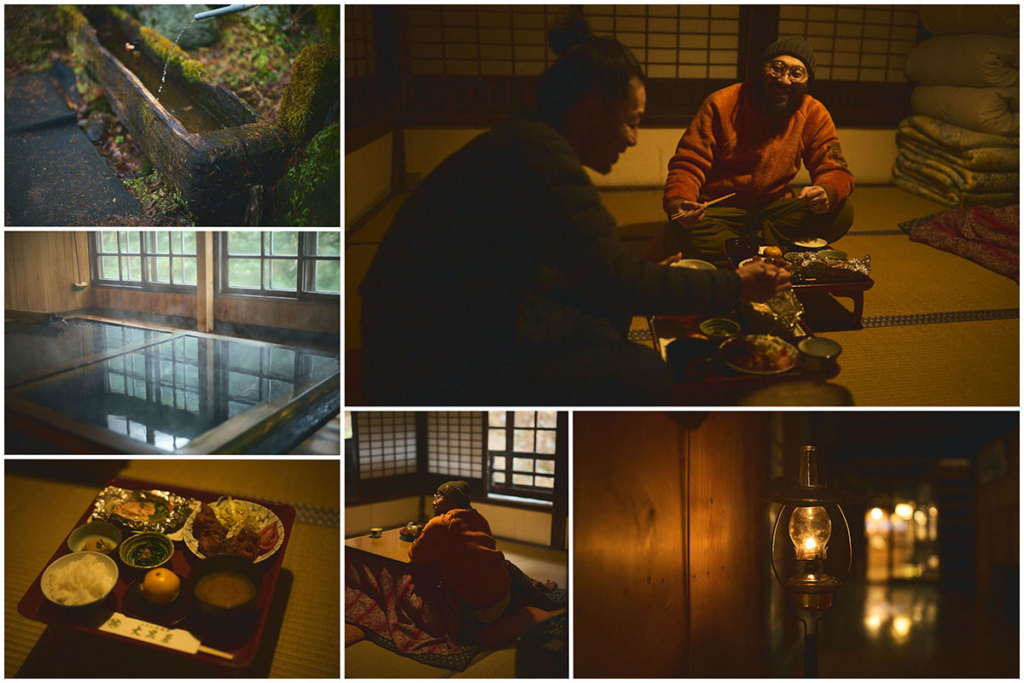 畳のうえに炬燵の敷かれた部屋に案内されると、大風呂へ汗を流しにいこうと廊下の板張りをミシミシという軋み音をさせながら歩いていった。ここの内温泉に浸かりながら、木枠でできた窓ガラス越しに夕日を眺めることは、このうえなく幸せである。部屋まで運んでいただいた夕食をいただきながら過ごす静かに時間も、まことに贅沢である。