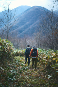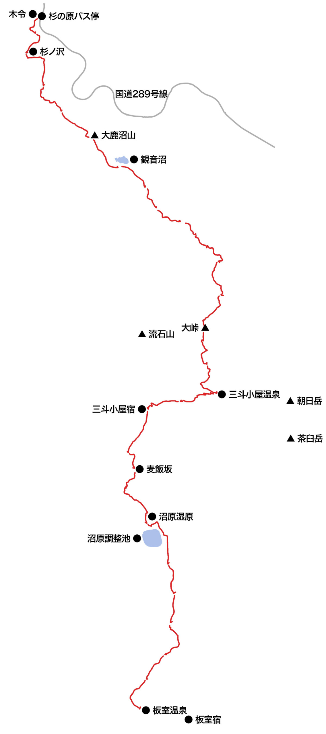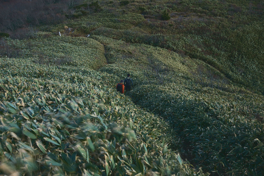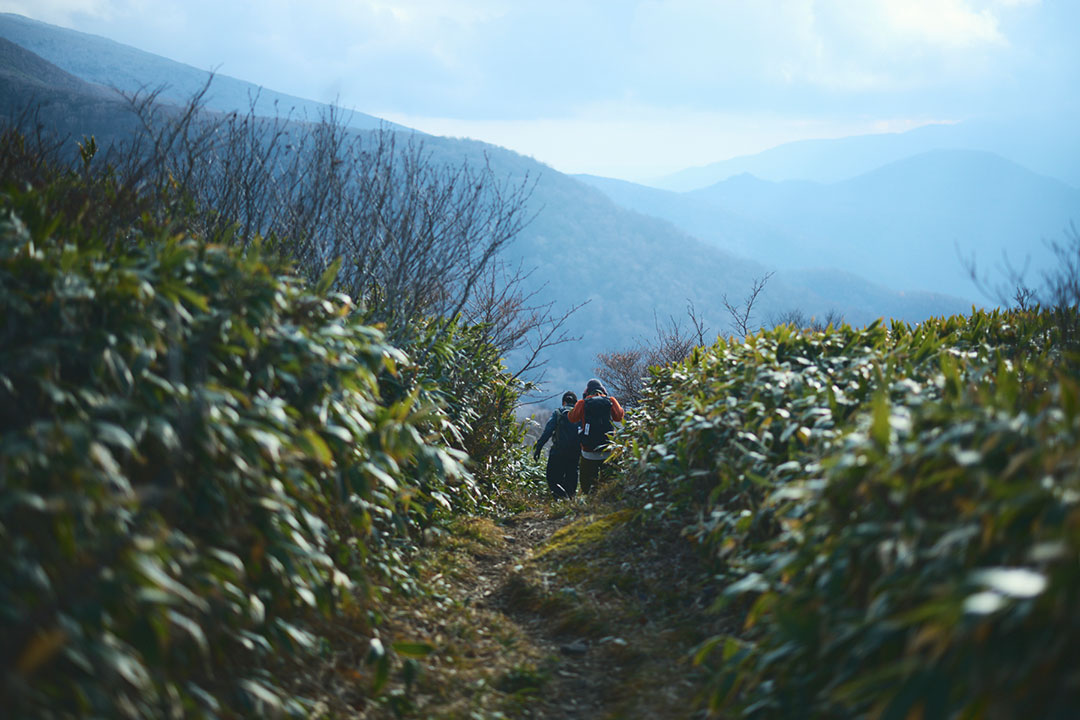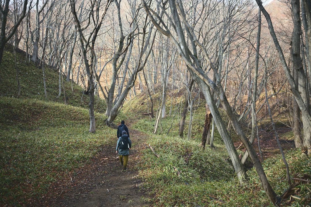 三斗小屋宿跡地からは、下り坂が続く麦飯坂を経て、沼原湿原を越えていく。ここからは、次の宿場街となる板室宿へと続く山道を辿っていく。麦飯坂の名前は、三斗小屋宿へと向かって急登に喘ぎながら、「おーい、もうすぐ帰るぞぉ」と、途中で帰宅を告げると三斗小屋宿で留守番をしていた女衆が夕食の準備をはじめるということで名づけられたそうだ。