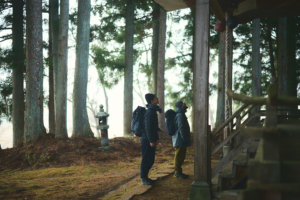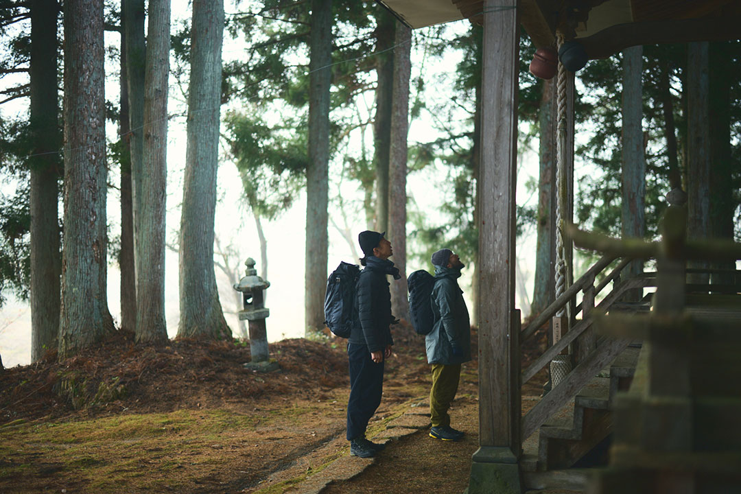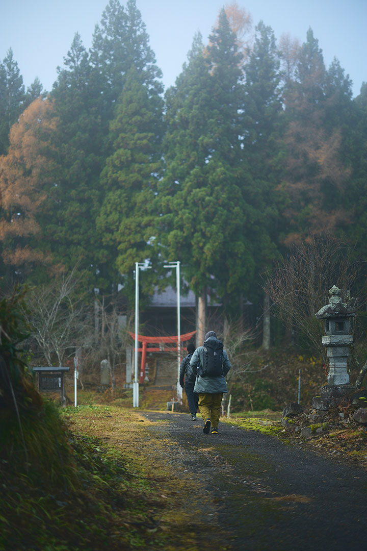 バスが走りだしてから、15分ほどで出発地点とした「杉の沢入り口」に到着する。ここからは、しばしの舗装路歩きとなる。朝靄に包まれた集落の景色を眺めながら歩いていくと、鎮守の森に囲まれた神社へと誘い込まれ、ここで登山の安全を祈願した。