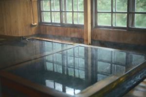 2日目の朝食前、大黒屋のもうひとつの浴室である岩風呂に入ろうとすると、高根沢家の次男である文人さんが小さな浴槽に浸かっていた。山小屋が作られる以前は、三斗小屋温泉もこのような岩のあいだに沸く温泉に入りに来る山の民たちに親しまれていたのだそうだ。