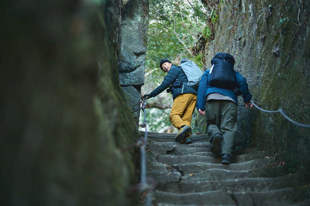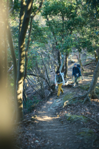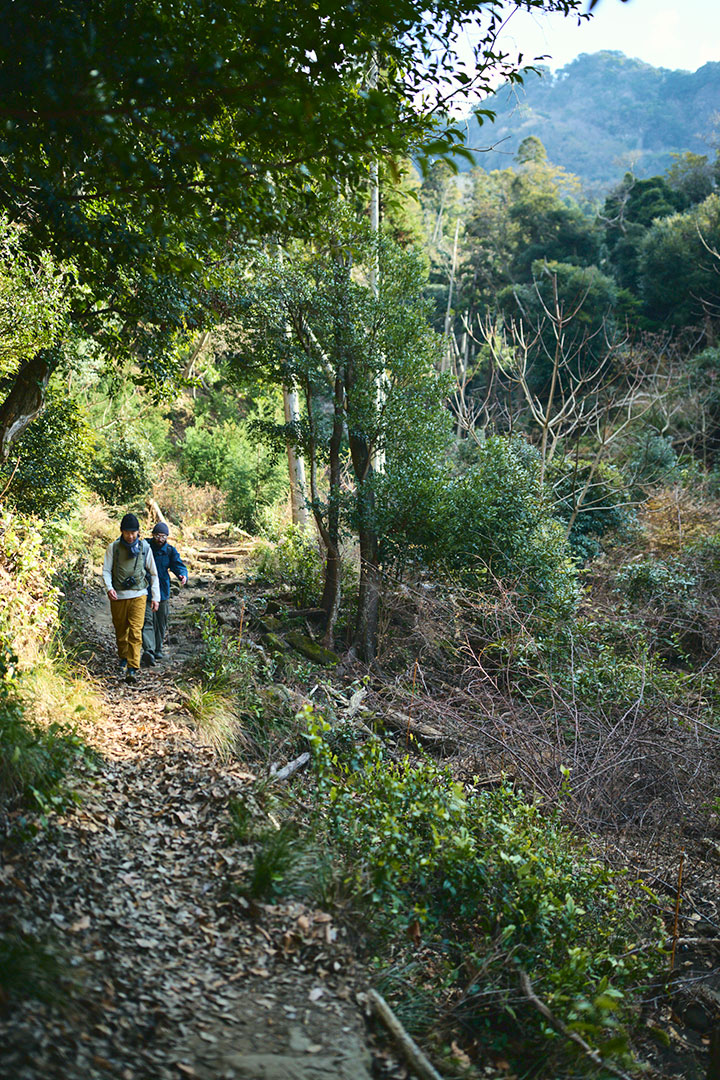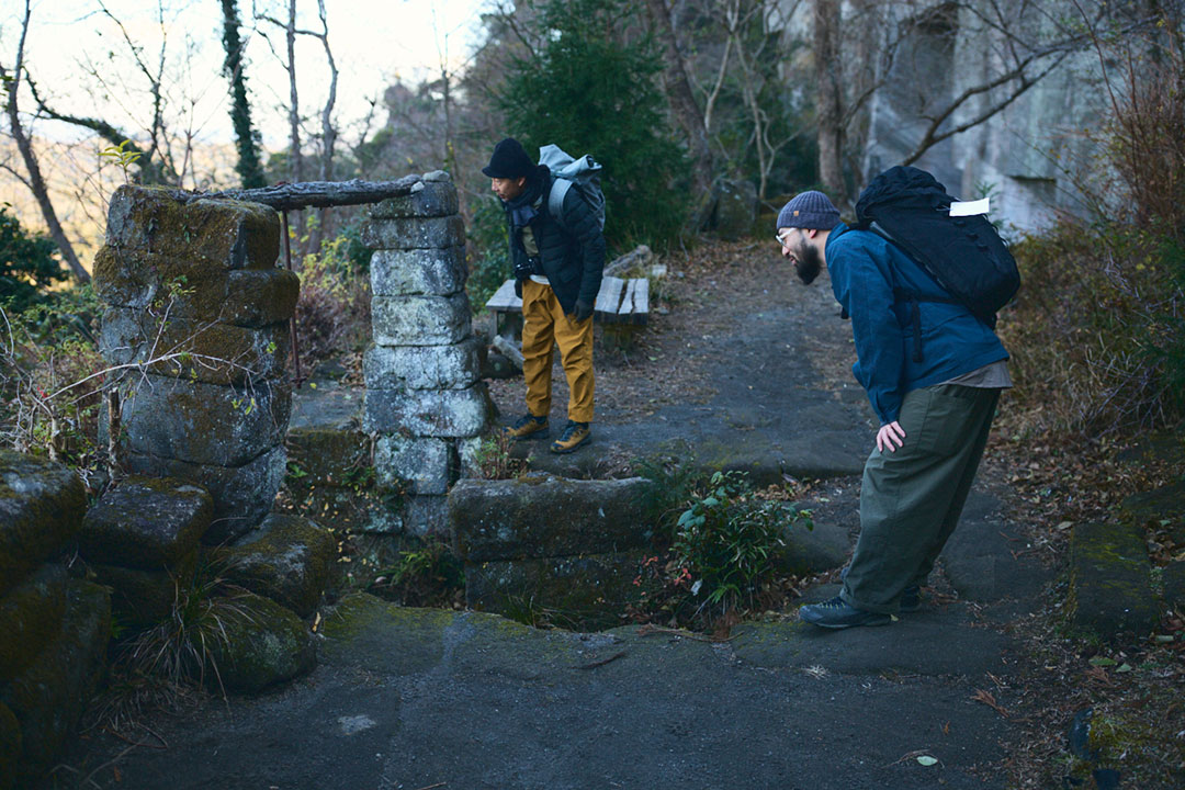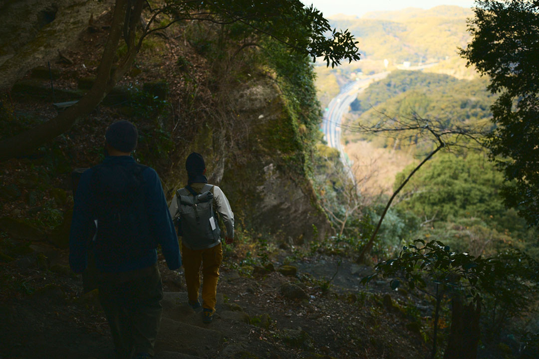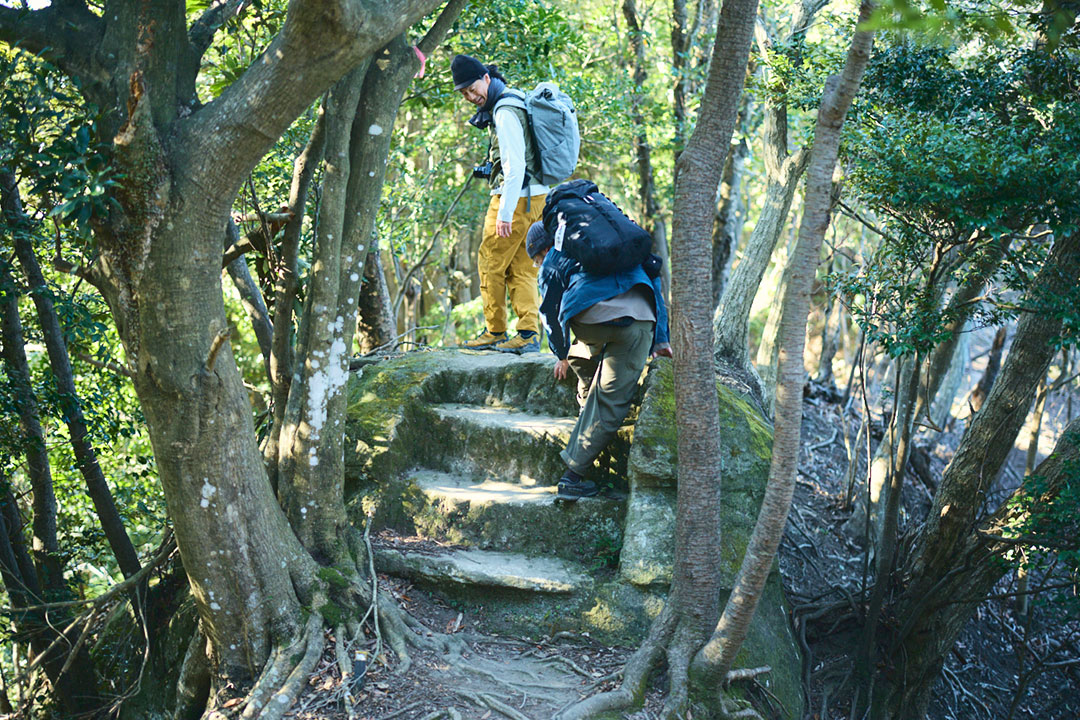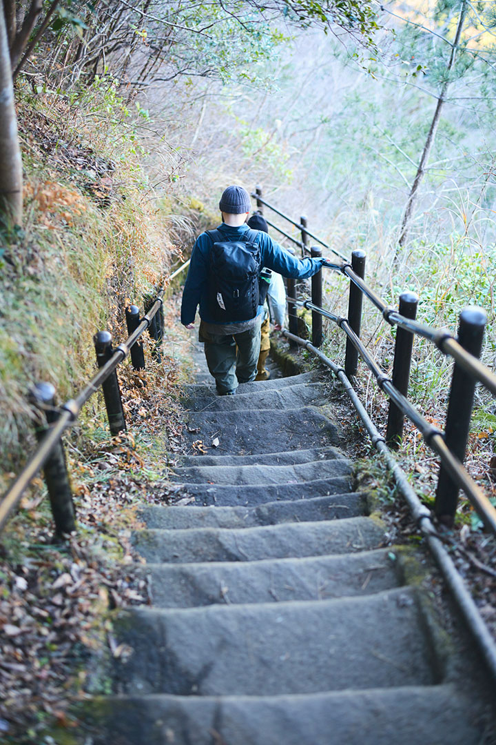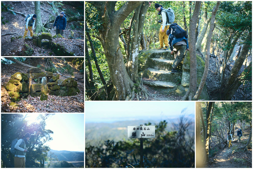 僕たちは登山口からの尾根道を伝って、心地よい冬の陽光を浴びながら鋸山の山頂へと向かった。岩盤を斫って作った階段がところどころにあり、石切場へと向かう期待感が高まっていく。