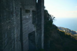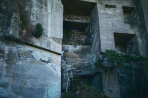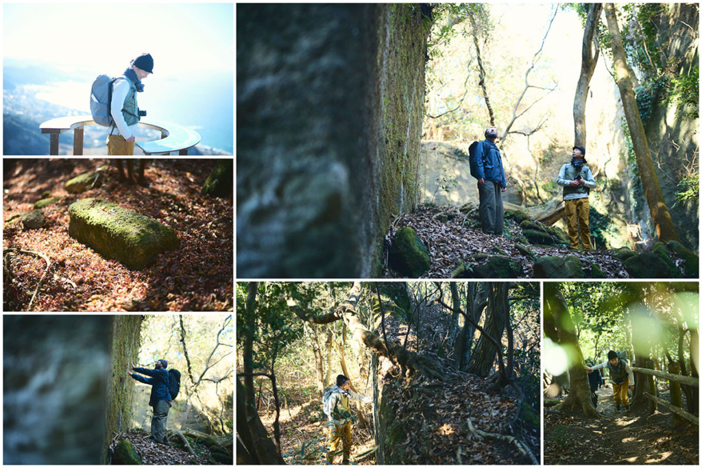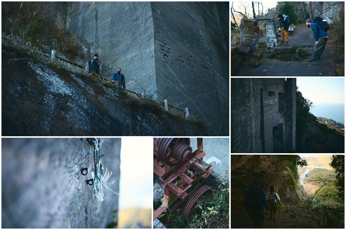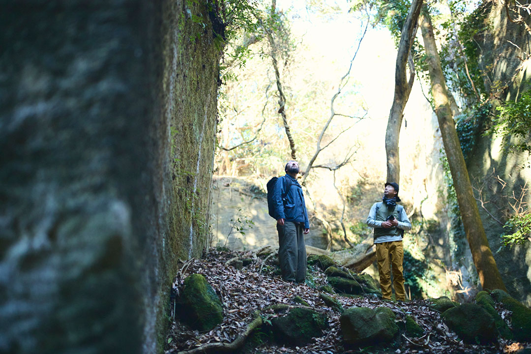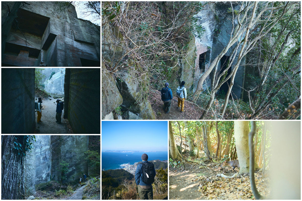 尾根道をさらに進んでいくと突然、垂直に切り落ちた岩壁が目前にあらわれる。そこからすぐのところには、足元から10数mもの落差を切り落とされた「吹抜洞窟」がある。山道をさらに進んでいくと、奥深くへと切り出した岩盤に観音様が彫られた「観音洞窟」、最大で95mもの高さがある「ラピュタの壁」からは東京湾や富士山を一望する。まるで太古の昔の神殿のような、房州石の切り出し跡が次々と続く。