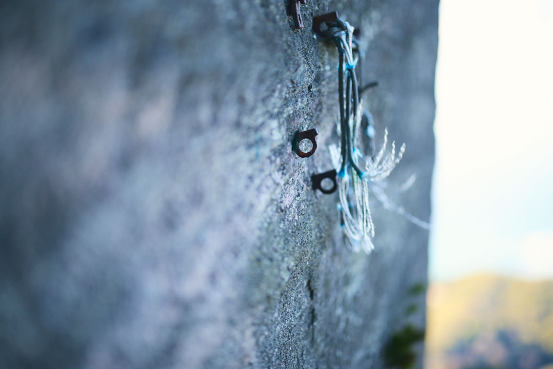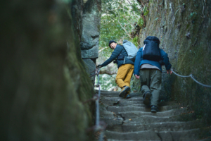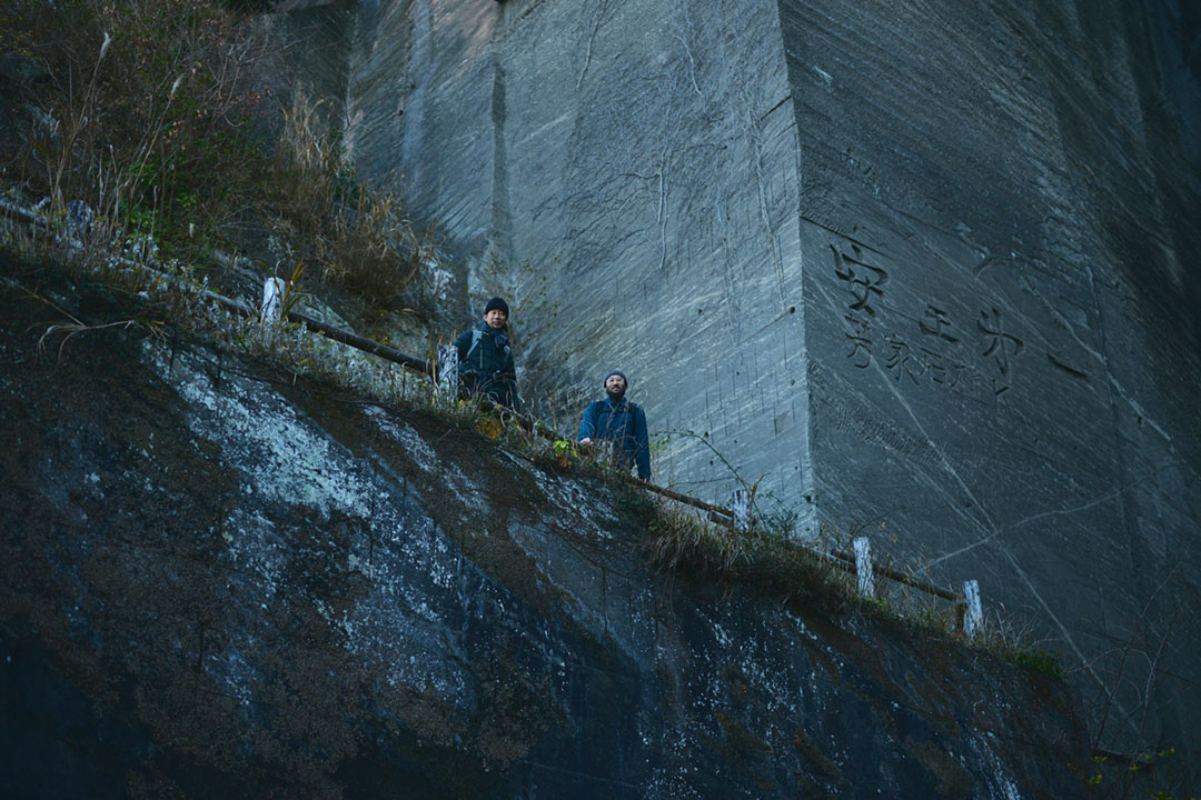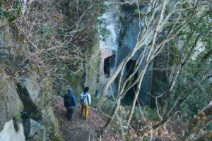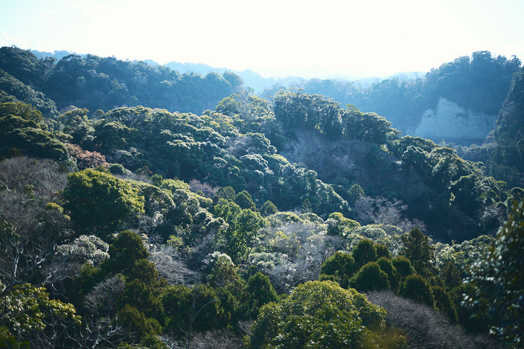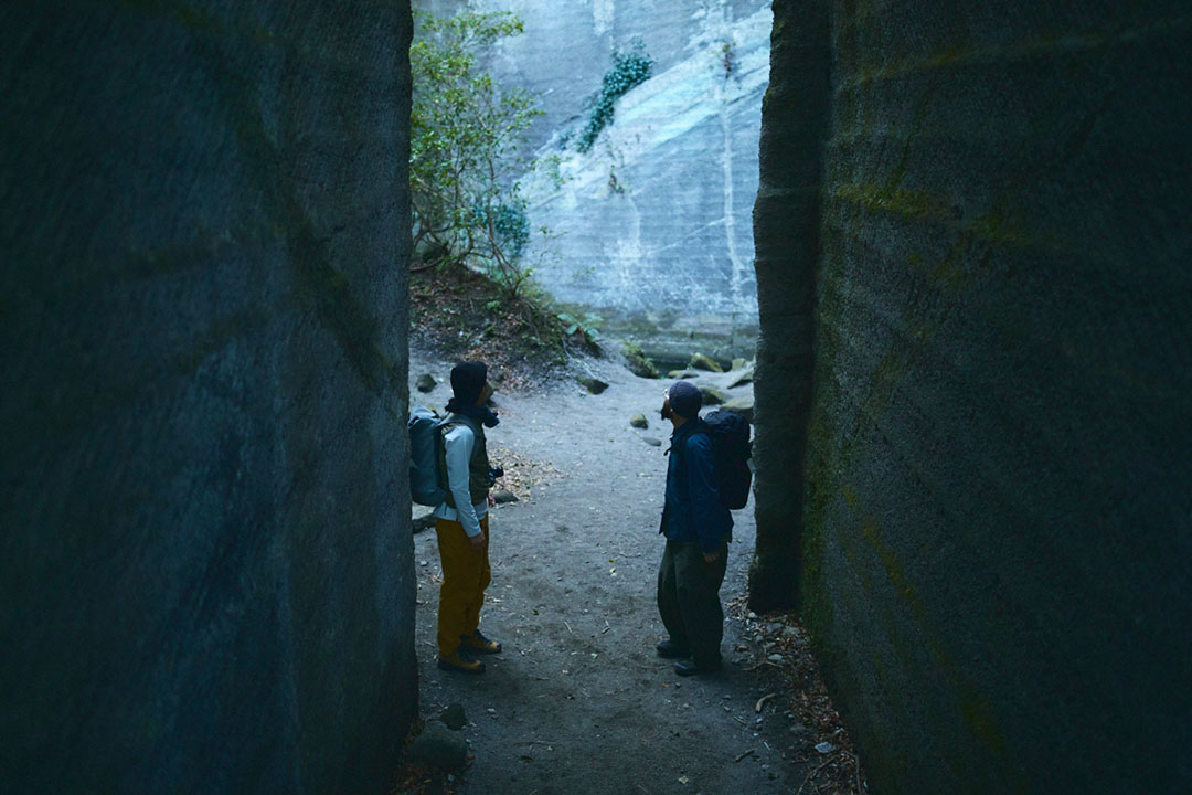 尾根道をさらに進んでいくと突然、垂直に切り落ちた岩壁が目前にあらわれる。そこからすぐのところには、足元から10数mもの落差を切り落とされた「吹抜洞窟」がある。山道をさらに進んでいくと、奥深くへと切り出した岩盤に観音様が彫られた「観音洞窟」、最大で95mもの高さがある「ラピュタの壁」からは東京湾や富士山を一望する。まるで太古の昔の神殿のような、房州石の切り出し跡が次々と続く。