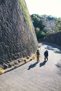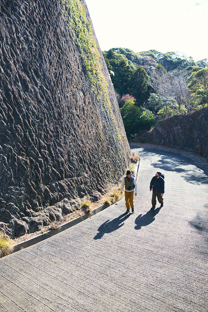 浜金谷駅へと向かう途中には、民家の門柱や灯篭、石塀や建物の土台として使われている房州石を見つけることができる。街中を歩きながら、僕たちは1985(昭和60)年の閉山後は、壮大な景色を眺めるために訪れる登山者に親しまれるようになった鋸山をあとにするのである。