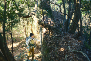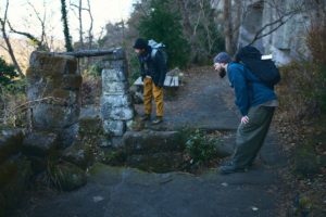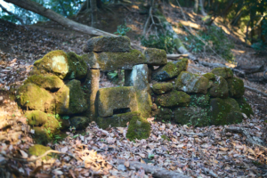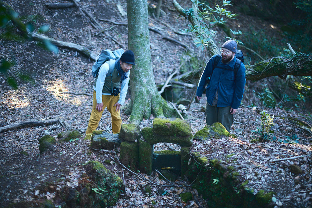 鋸山の山頂での休憩を終えて、ふたたび歩きはじめると鞍部に広がった小さな平地に人の手で積み上げられた石組みを見つけた。木炭を作るための炭焼き窯跡である。こうした炭焼き窯跡は、鋸山周辺に数多く残されているという。