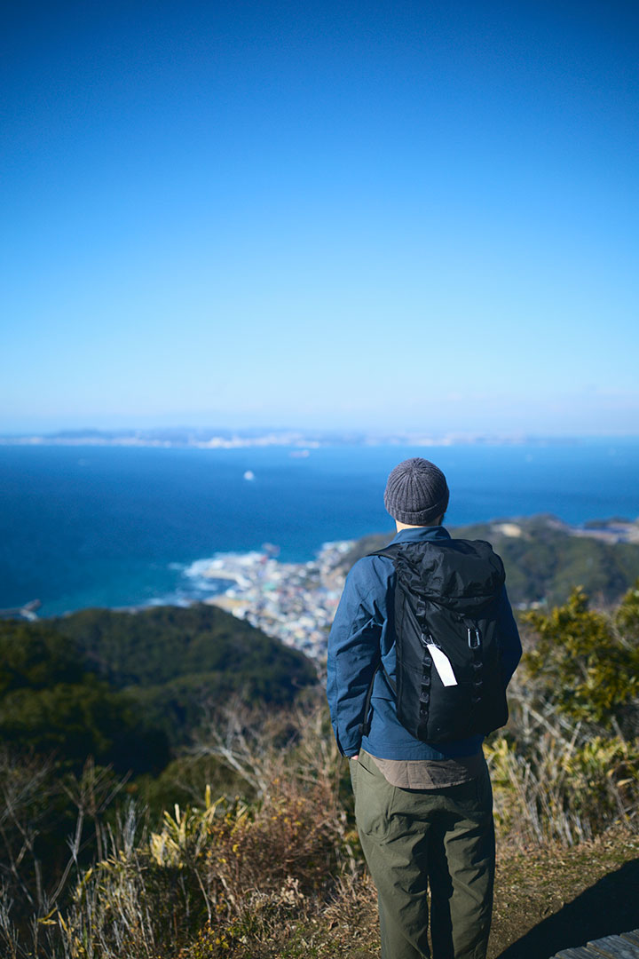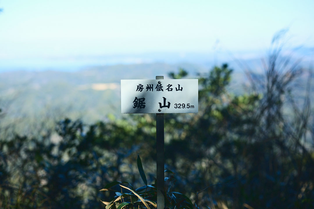 小休止を挟みながら、歩くこと約1時間。標高329.5mの鋸山の山頂へと到着する。山頂には、「房州低名山 鋸山 329.5m」と道標が立っていた。木々の枝の向こうに東京湾が広がっており、青く輝く海面には大小の船舶が残した航跡が白く伸びている。