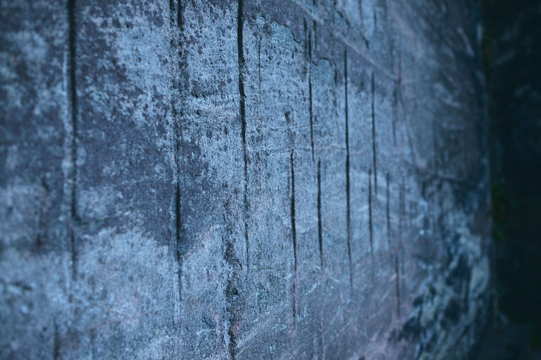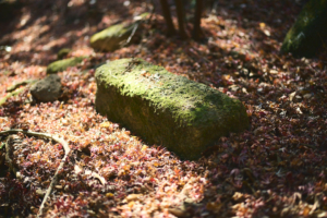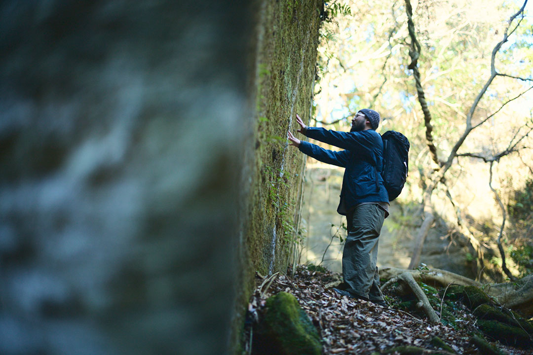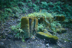 山腹にある石材の集積所には、苔に覆われた10数本の房州石が残されている。ここまで歩いてきた山中にも、ところどころで切り出されたままの房州石が無造作に重ねられて残されている。このことを不思議に思っていた僕は、鈴木さんに素朴な疑問を投げかけた。すると、「出荷を待たずに事業が終わってしまったんでしょうね」との答えが返ってきた。