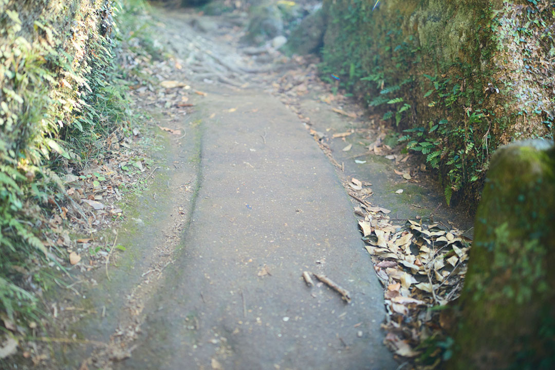 登山道は、石材や石くずを運搬するために作られた「切通し跡」といった運搬路を進む。