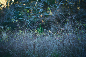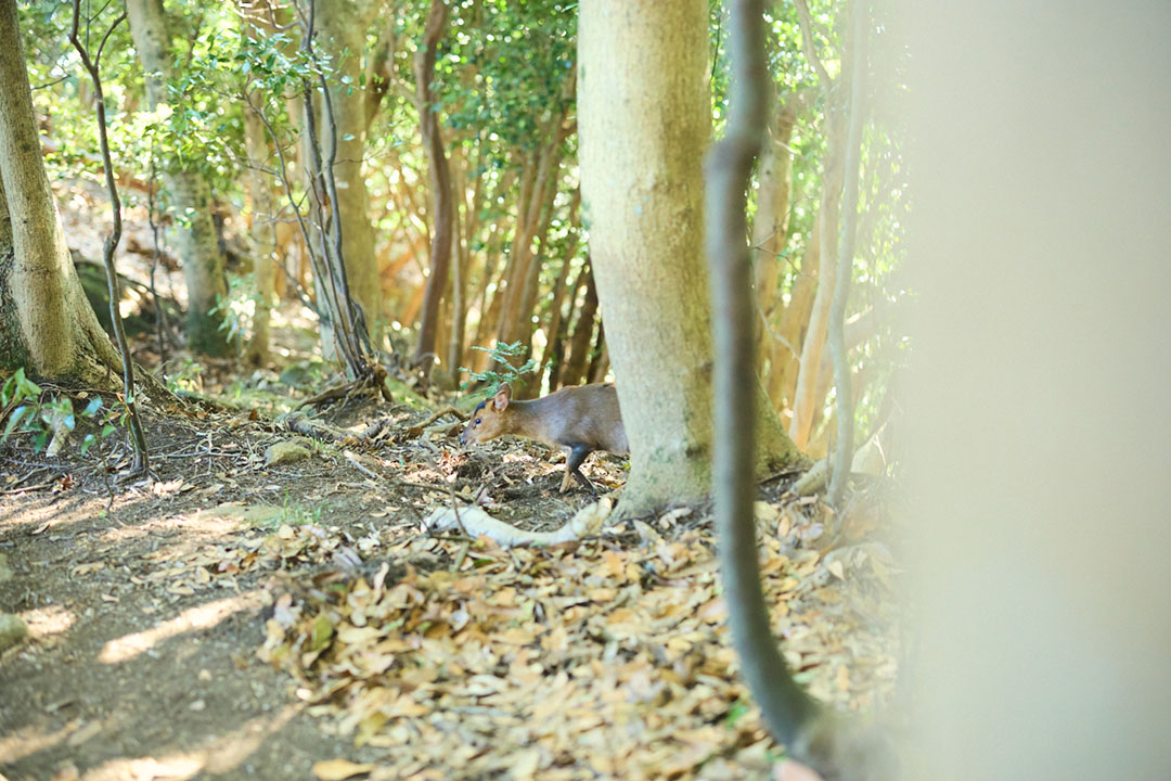 ガサゴソという物音に驚いてうしろを振り返る。小さなシカ科の動物キョンが草を食んでいた。国内では房総半島と伊豆大島にのみ生息するという。小さめの中型犬ほどの大きさである。斜面の下のほうには家族であろう、ほかにも2〜3匹のキョンがこちらを注意深く観察していた。
