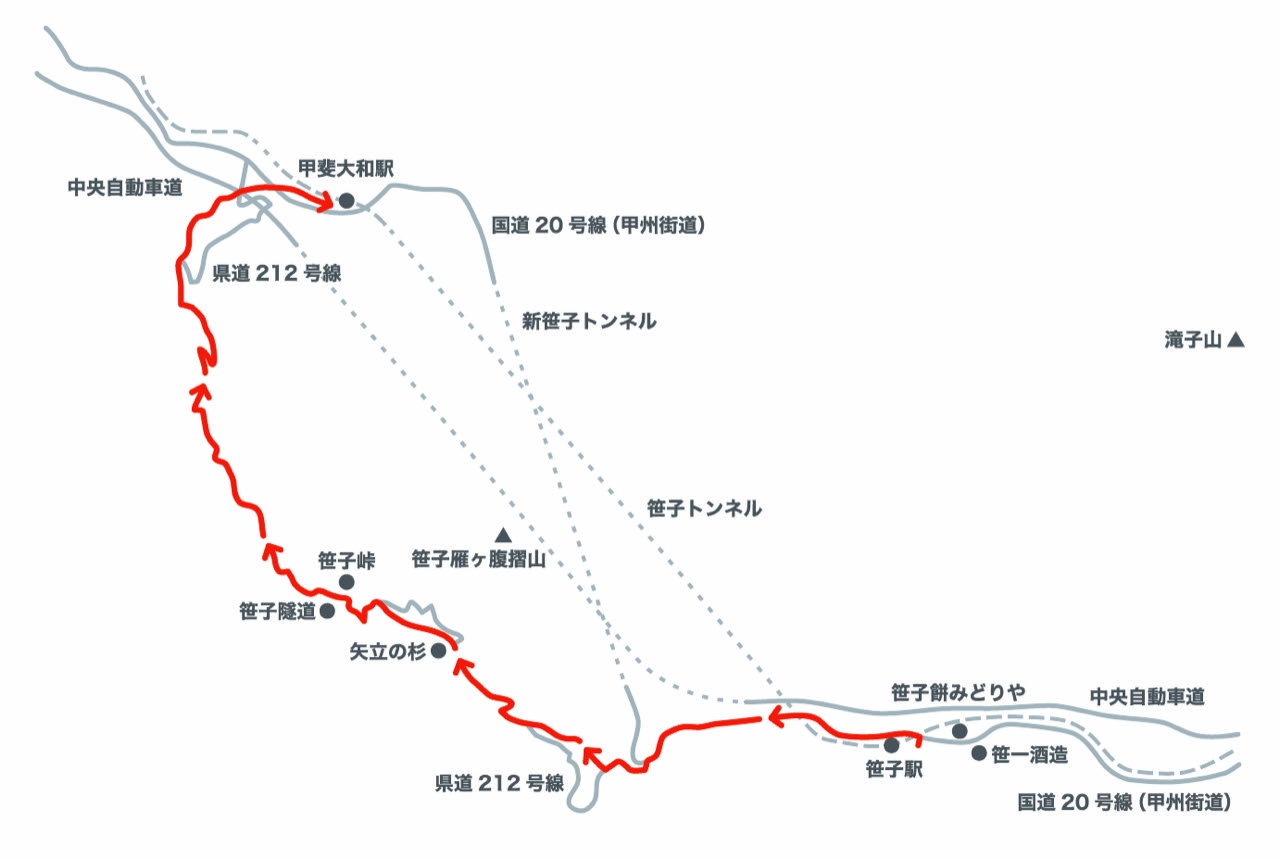 車両が甲斐大和駅に到着するまでには、全長4,656mの笹子トンネルを通り抜ける。僕たちは、このトンネルがつらぬく笹子峠を徒歩で越えていく。この峠道は、江戸幕府によって整備された五街道のひとつである甲州街道の中間地点にあたり、黒野田宿(現在の山梨県大月市)と駒飼宿(同甲州市)というふたつの宿場街をつなぐ街道における最大の難所であった。