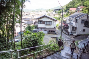 大型トラックや路線バスが行き交う国道20号線を避けるようにして、民家が並ぶ裏道を歩いていく。大きな木々に覆われた丘の上へと続く階段があり、いま来た道を振り返れば中央本線の線路を見下ろすようなところになっている。そこへやってきた特急列車が、丘の下を通るトンネルへと吸い込まれていった。