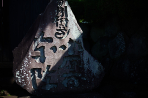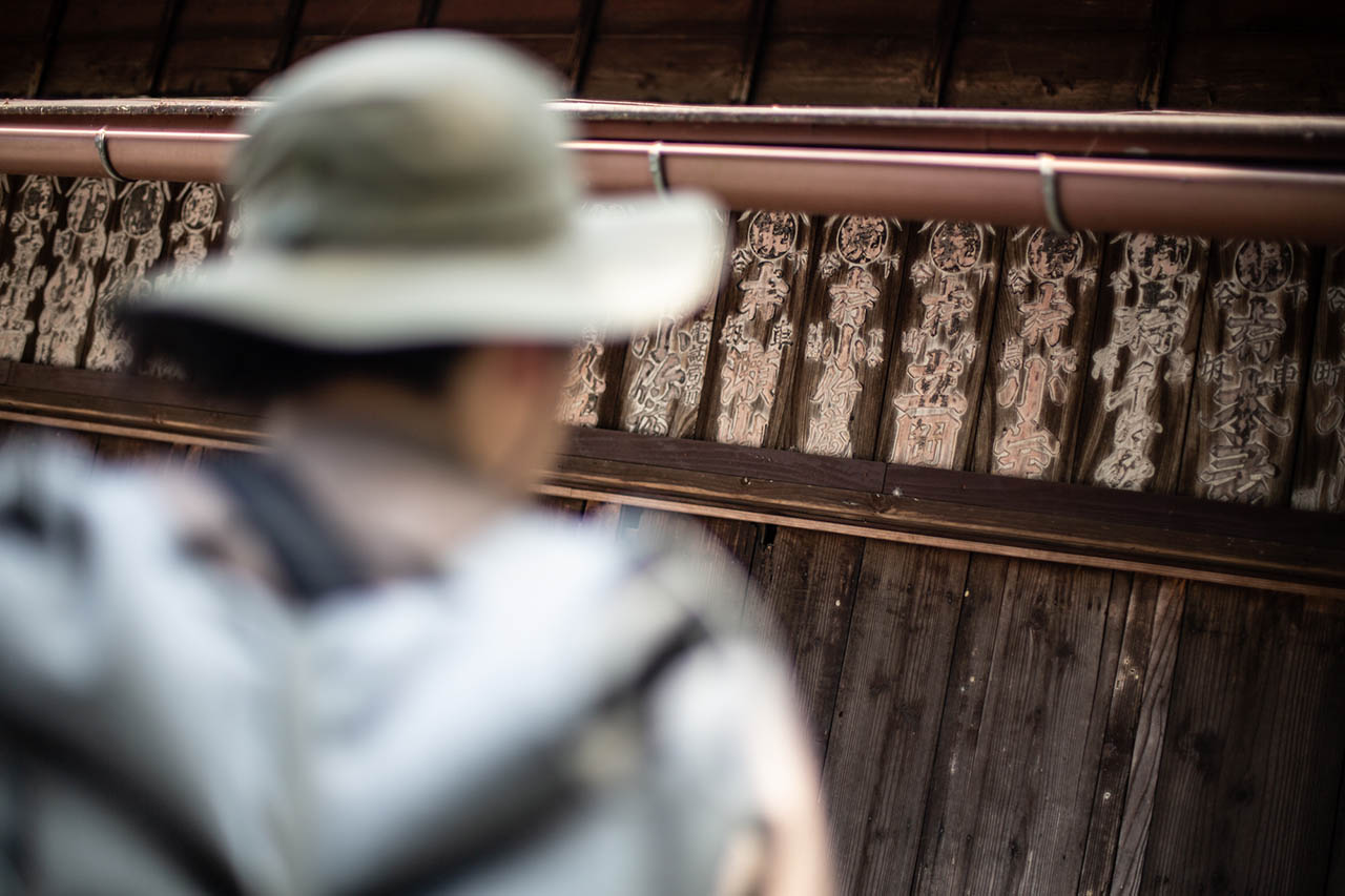 江戸後期に「ふじや新兵衛」と呼ばれた旅籠屋跡の軒先では、講札がぎっしりと張られているさまを見ることができる。蛇滝信仰では、高尾山ケーブルカーの山頂駅から北側へと降ったところにある蛇滝を本尊としており、いまから300年ほど前から滝修行の場として整えられた。その蛇滝への分岐点にあるのが「高尾山道」の石碑であり、かつては金比羅台を経由する尾根道同様によく歩かれた道であっただろう。