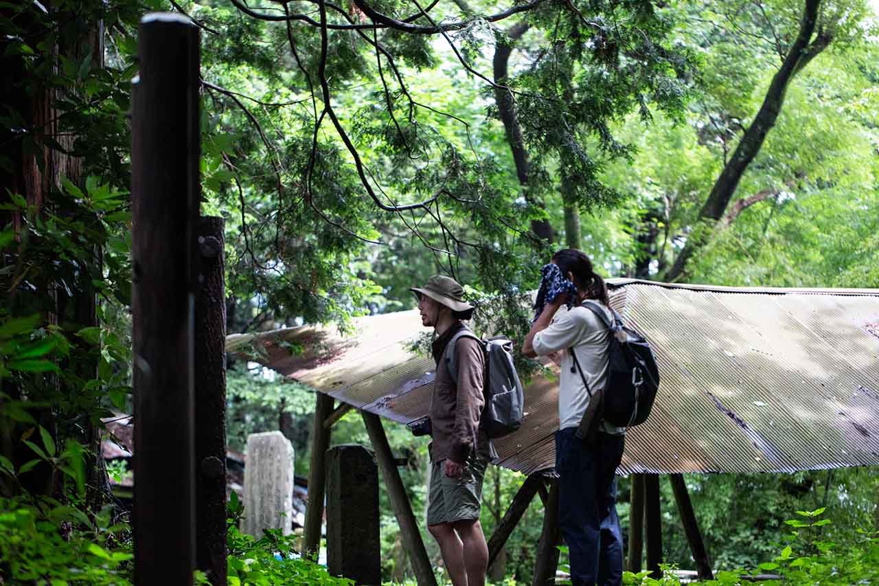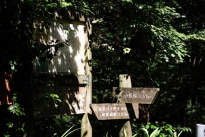 中峠茶屋という茶屋跡を見ながら約40分、汗を拭いながら小仏峠へと到着した。ここにも茶屋跡が残されており、周囲には地蔵や石祠などが散在している。峠道を越えてきた旅人たちで、かつては大賑わいしていたことであろう。ひっそりと静まりかえった小仏峠で、僕たちは茶屋跡のそばに備えつけられたベンチに座わり、微風に吹かれながらほてった体を冷ました。