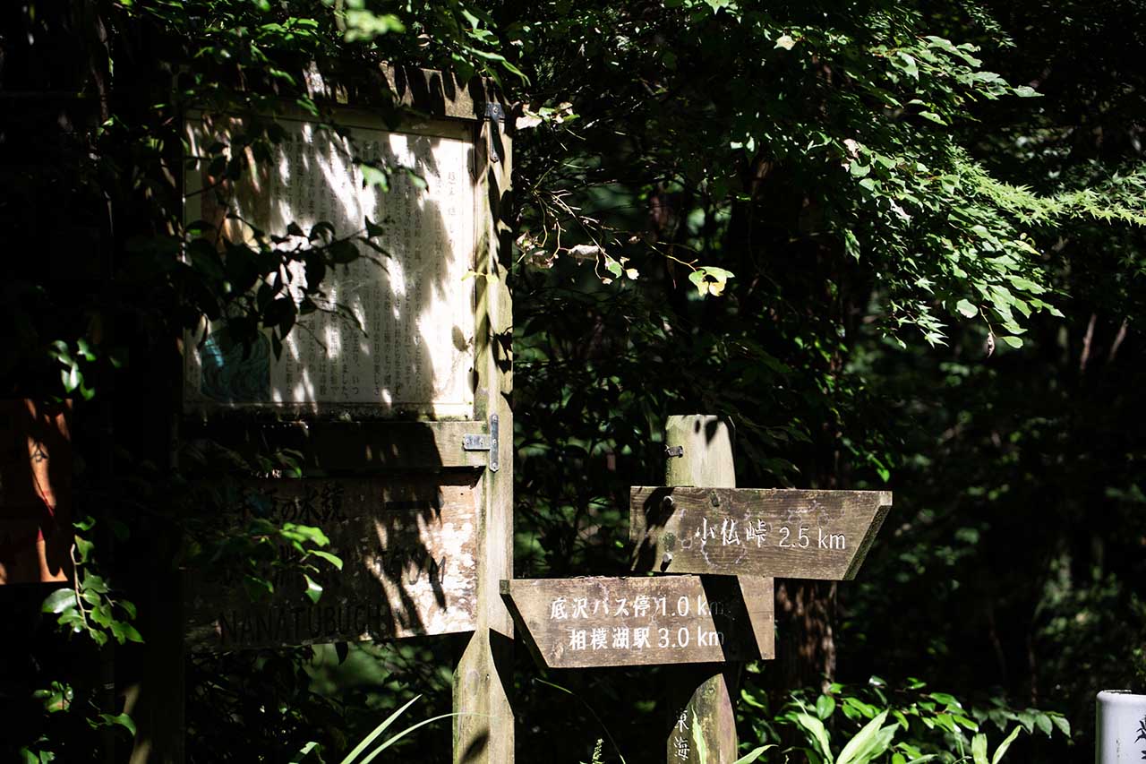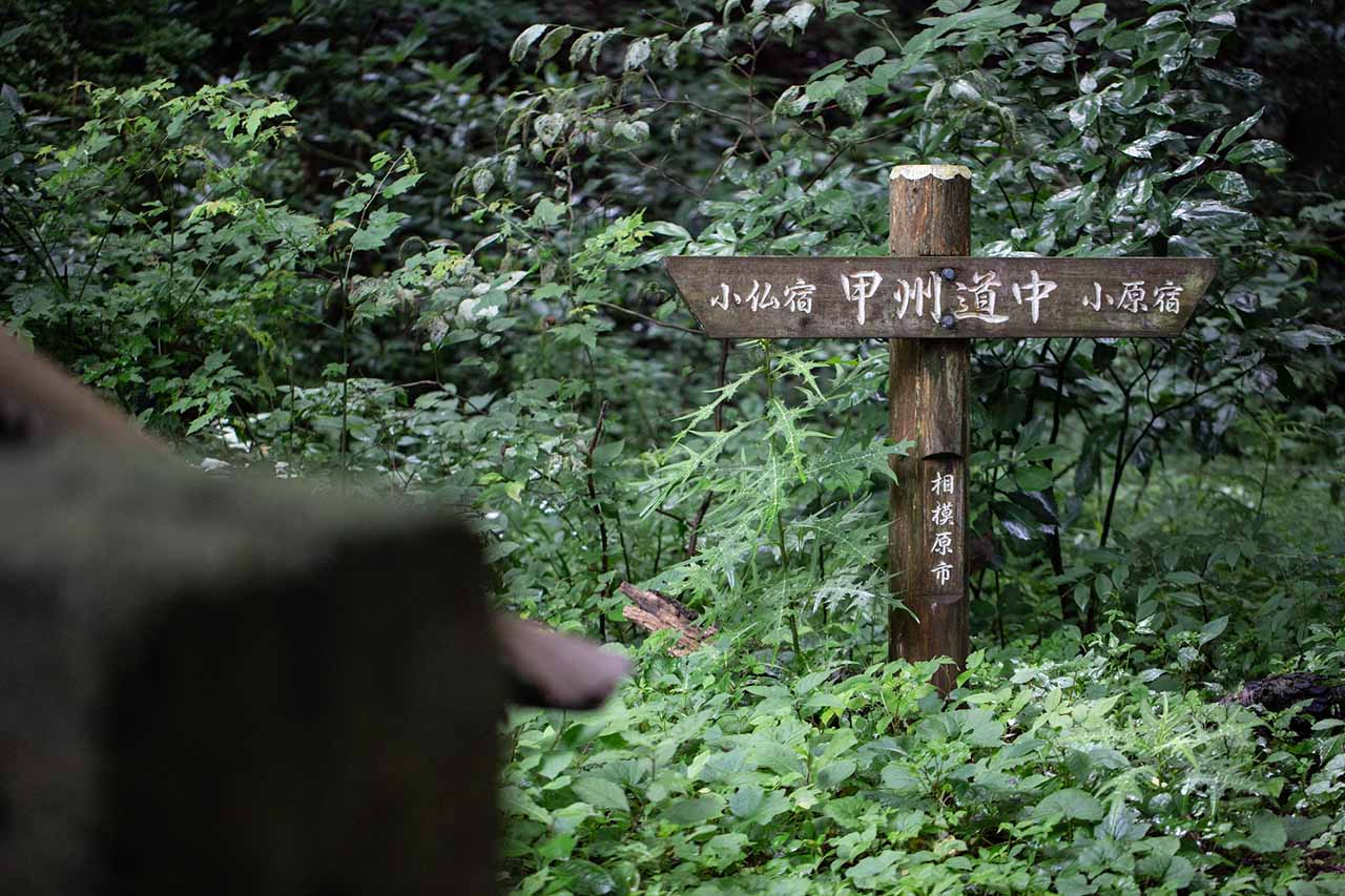 中央自動車道の高架橋を越えると、森のなかに広がる底沢集落へと誘い込まれていく。集落からの道は、「小仏峠 2.5km」という道標にあるように右手へと折れて、徐々に標高を上げていく。本格的な峠道となるのは、まもなくである。
