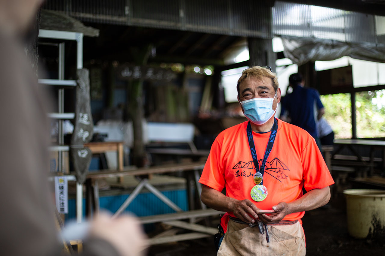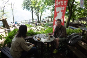 なめこそばと茶屋の天ぷら、味噌でんがくを注文して奥のテーブル席に腰掛ける。3代目店主の青木宏之さんは、彼の祖父が戦前に茶を出したのが景信茶屋のはじまりだと話す。当初は、沢で汲んだ水をためて、湯を沸かして茶を出していたという。